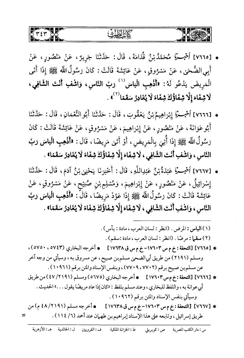 7667- أَخبَرنا عَبدَةُ بنُ عَبدِ اللهِ، قَالَ: أَخبَرنا يَحْيَى بنُ آدَمَ، قَالَ: حَدَّثنا إِسرَائِيلُ، عَن مَنْصُورٍ، عَن إِبْرَاهِيمَ، وَمُسْلِمِ بنِ صُبَيْحٍ، عَن مَسْرُوقٍ، عَن عَائِشَةَ، قَالَتْ: كَانَ رَسُولُ اللهِ صَلى الله عَلَيهِ وسَلم إِذَا عَوَّذَ مَرِيضًا قَالَ: أَذْهِبِ البَاسَ رَبَّ النَّاسِ، وَاشْفِ أَنْتَ الشَّافِي، لا شِفَاءَ إِلاَّ شِفَاؤُكَ، شِفَاءً لا يُغَادِرُ سَقَمًا.