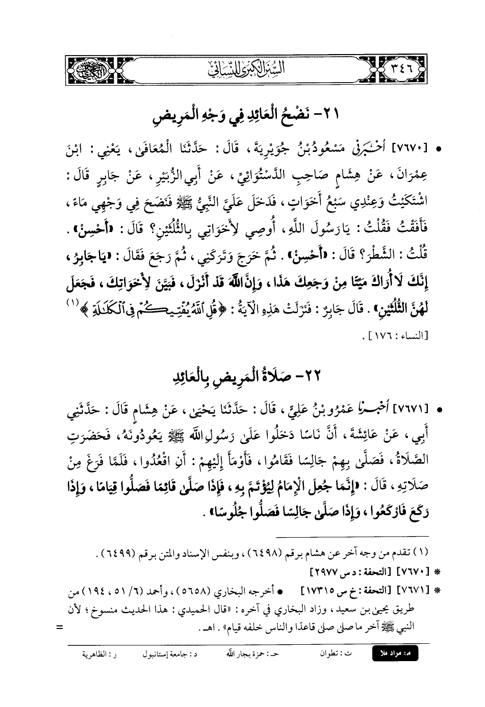 7670- أَخبَرنِي مَسْعُودُ بنُ جُوَيْرِيَةَ، قَالَ: حَدَّثنا المُعَافَى، يَعْنِي ابْنَ عِمْرَانَ، عَن هِشَامٍ, صَاحِبِ الدَّسْتُوَائِيِّ، عَن أَبي الزُّبَيْرِ، عَن جَابِرٍ، قَالَ: اشْتَكَيْتُ وَعِنْدِي سَبْعُ أَخَوَاتٍ، فَدَخَلَ عَلَيَّ النَّبيُّ صَلى الله عَلَيهِ وسَلم, فَنَضَحَ فِي وَجْهِي مَاءً, فَأَفَقْتُ، فَقُلْتُ: يَا رَسُولَ اللهِ، أُوصِي لأَخَوَاتِي بِالثُّلُثَيْنِ؟ قَالَ: أَحْسِنْ، قُلْتُ: الشَّطْرُ؟ قَالَ: أَحْسِنْ، ثُمَّ خَرَجَ وَتَرَكَنِي، ثُمَّ رَجَعَ, فَقَالَ: يَا جَابِرُ، إِنَّكَ لا أُرَاكَ مَيِّتًا مِنْ وَجَعِكَ هَذَا، وَإِنَّ اللهَ قَدْ أَنْزَلَ فَبَيَّنَ لأَخَوَاتِكَ، فَجَعَلَ لَهُنَّ الثُّلُثَيْنِ، قَالَ جَابِرٌ: فَنَزَلَتْ هَذِهِ الآيَةُ: {قُلِ اللهُ يُفْتِيكُمْ فِي الكَلالَةِ}.