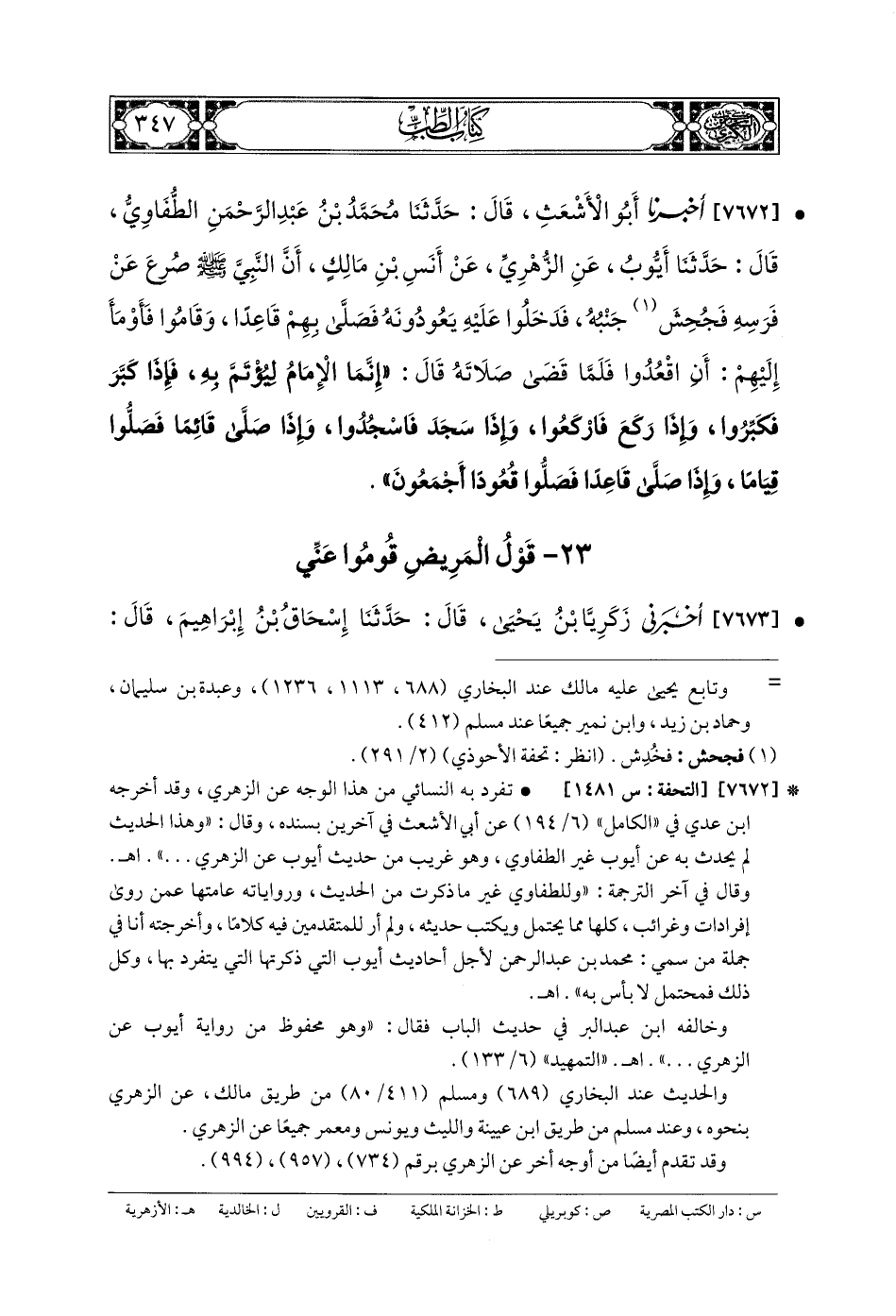 7672- أَخبَرنا أَبو الأَشْعَثِ، قَالَ: حَدَّثنا مُحَمدُ بنُ عَبدِ الرَّحمَنِ الطُّفَاوِيُّ، قَالَ: حَدَّثنا أَيوبُ، عَنِ الزُّهْرِيِّ، عَن أَنَسِ بنِ مَالِكٍ، أَنَّ النَّبيَّ صَلى الله عَلَيهِ وسَلم صُرِعَ عَن فَرَسِهِ, فَجُحِشَ جَنْبُهُ، فَدَخَلُوا عَلَيْهِ يَعُودُونَهُ، فَصَلَّى بِهِمْ قَاعِدًا، وَقَامُوا، فَأَوْمَأَ إِلَيْهِمْ أَنِ اقْعُدُوا، فَلَمَّا قَضَى صَلاتَهُ قَالَ: إِنَّمَا الإِمَامُ لِيُؤْتَمَّ بِهِ، فَإِذَا كَبَّرَ فَكَبِّرُوا، وَإِذَا رَكَعَ فَارْكَعُوا، وَإِذَا سَجَدَ فَاسْجُدُوا، وَإِذَا صَلَّى قَائِمًا فَصَلَّوْا قِيَامًا، وَإِذَا صَلَّى قَاعِدًا فَصَلَّوْا قُعُودًا أَجْمَعُونَ.
