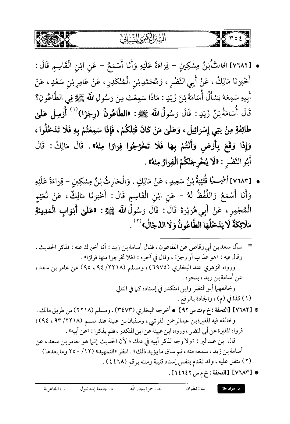 7682- الحَارِثُ بنُ مِسْكِينٍ، قِرَاءَةً عَلَيْهِ، وَأنا أَسْمَعُ، عَنِ ابْنِ القَاسِمِ، قَالَ: أَخبَرنا مَالِكٌ، عَن أَبي النَّضْرِ، وَمُحَمدِ بنِ المُنْكَدِرِ، عَن عَامِرِ بنِ سَعْدٍ، عَن أَبيهِ، سَمِعَهُ يَسْأَلُ أُسَامَةَ بْنَ زَيْدٍ، مَاذَا سَمِعْتَ مِنْ رَسُولِ اللهِ صَلى الله عَلَيهِ وسَلم فِي الطَّاعُونِ؟ قَالَ أُسَامَةُ بنُ زَيْدٍ، قَالَ رَسُولُ اللهِ صَلى الله عَلَيهِ وسَلم: الطَّاعُونُ رِجْزٌ أُرْسِلَ عَلَى طَائِفَةٍ مِنْ بَنِي إِسرَائِيلَ، وَعَلَى مَنْ كَانَ قَبْلَكُمْ، فَإِذَا سَمِعْتُمْ بِهِ فَلا تَدْخُلُوا، وَإِذَا وَقَعَ بِأَرْضٍ وَأَنْتُمْ بِهَا، فَلا تَخْرُجُوا فِرَارًا مِنْهُ، قَالَ مَالِكٌ: قَالَ أَبو النَّضْرِ: لا يُخْرِجَنَّكُمُ الفِرَارُ مِنْهُ.