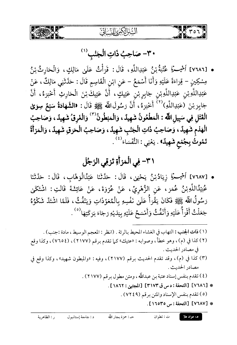 7686- أَخبَرنا عُتْبَةُ بنُ عَبدِ اللهِ، قَالَ: قَرَأْتُ عَلَى مَالِكٍ. وَالحَارِثِ بنِ مِسْكِينٍ، قِرَاءَةً عَلَيْهِ، وَأَنَا أَسْمَعُ، عَنِ ابْنِ القَاسِمِ، قَالَ: حَدَّثني مَالِكٌ، عَن عَبدِ اللهِ بنِ عَبدِ اللهِ بنِ جَابِرِ بنِ عَتِيكٍ، أَنَّ عَتِيكَ بْنَ الحَارِثِ أَخْبَرَهُ؛ أَنَّ جَابِرَ بْنَ عَتِيكٍ (1) أَخْبَرَهُ؛ أَنَّ رَسُولَ اللهِ صَلى الله عَلَيهِ وسَلم قَالَ: الشَّهَادَةُ سَبْعٌ سِوَى القَتْلِ فِي سَبِيلِ اللهِ: المَطْعُونُ شَهِيدٌ، وَالمَبْطُونُ شَهِيدٌ (2)، وَالغَرِقُ شَهِيدٌ، وَصَاحِبُ الهَدْمِ شَهِيدٌ، وَصَاحِبُ ذَاتِ الجَنْبِ شَهِيدٌ، وَصَاحِبُ الحَرَقِ شَهِيدٌ، وَالمَرْأَةُ تَمُوتُ بِجُمْعٍ شَهِيدٌ، يَعْنِي النُّفَسَاءَ.