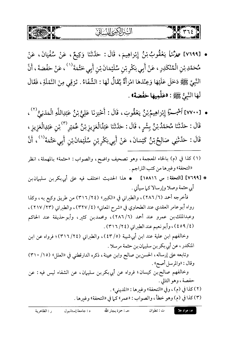 7700 - أَخبَرنا إِبْرَاهِيمُ بنُ يَعْقُوبَ، قَالَ: أَخبَرنا عَليُّ بنُ عَبدِ اللهِ المَدَنِيُّ، قَالَ: حَدَّثنا مُحَمدُ بنُ بِشْرٍ، قَالَ: حَدَّثنا عَبدُ العَزِيزِ بنُ عُمَرِ (1) بنِ عَبدِ العَزِيزِ، قَالَ: حَدَّثني صَالِحُ بنُ كَيْسَانَ، عَن أَبي بَكْرِ بنِ سُلَيْمَانَ بنِ أَبي حَثْمَةَ (2)، أَنَّ الشِّفَاءَ بِنْتَ عَبدِ اللهِ قَالَتْ: دَخَلَ عَلَيَّ رَسُولُ اللهِ صَلى الله عَلَيهِ وسَلم وَأَنَا قَاعِدَةٌ عِنْدَ حَفْصَةَ، قَالَ: أَلا تُعَلِّمِينَ هَذِهِ رُقْيَةَ النَّمْلَةِ كَمَا عَلَّمْتِهَا الكِتَابَةَ؟.