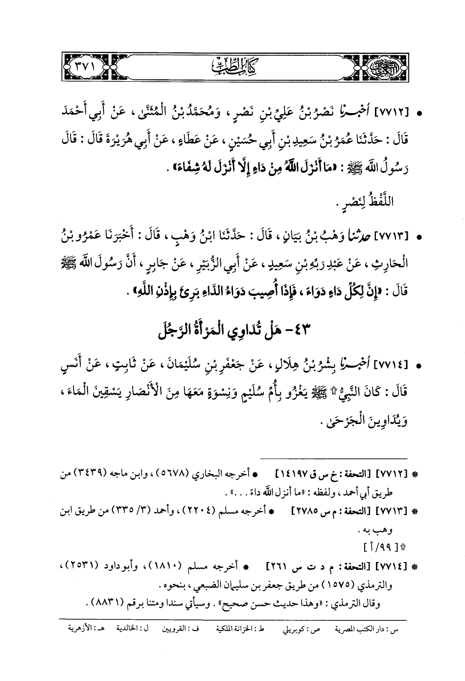 7713- حَدَّثنا وَهْبُ بنُ بَيَانٍ، قَالَ: حَدَّثنا ابْنُ وَهْبٍ، قَالَ: أَخبَرنا عَمْرُو بنُ الحَارِثِ، عَن عَبدِ رَبِّهِ بنِ سَعِيدٍ، عَن أَبي الزُّبَيْرِ، عَن جَابِرٍ، أَنَّ رَسُولَ اللهِ صَلى الله عَلَيهِ وسَلم قَالَ: إِنَّ لِكُلِّ دَاءٍ دَوَاءً، فَإِذَا أُصِيبَ دَوَاءُ الدَّاءِ, بَرِئَ بِإِذْنِ اللهِ.