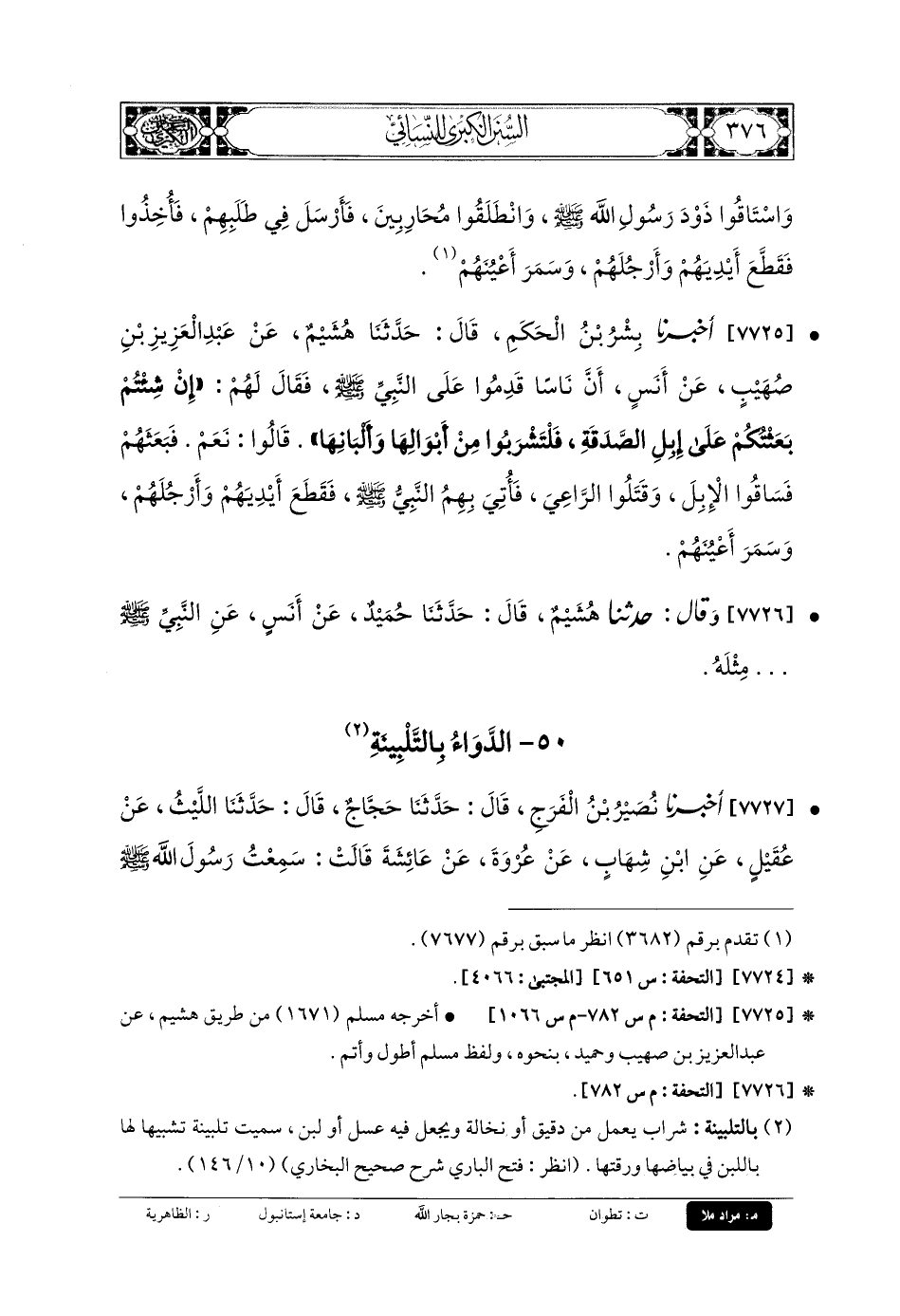 7725- أَخبَرنا بِشْرُ بنُ الحَكَمِ، قَالَ: حَدَّثنا هُشَيْمٌ، عَن عَبدِ العَزِيزِ بنِ صُهَيْبٍ، عَن أَنَسٍ، أَنَّ نَاسًا قَدِمُوا عَلَى النَّبيِّ صَلى الله عَلَيهِ وسَلم فَقَالَ لَهُمْ: إِنْ شِئْتُمْ بَعَثْتُكُمْ عَلَى إِبِلِ الصَّدَقَةِ، فَلْتَشْرَبُوا مِنْ أَبْوَالِهَا وَأَلْبَانِهَا، قَالُوا: نَعَمْ، فَبَعَثَهُمْ, فَسَاقُوا الإِبِلَ، وَقَتَلُوا الرَّاعِيَ، فَأُتِيَ بِهِمُ النَّبيُّ صَلى الله عَلَيهِ وسَلم، فَقَطَّعَ أَيْدِيَهُمْ وَأَرْجُلَهُمْ، وَسَمَرَ أَعْيُنَهُمْ.