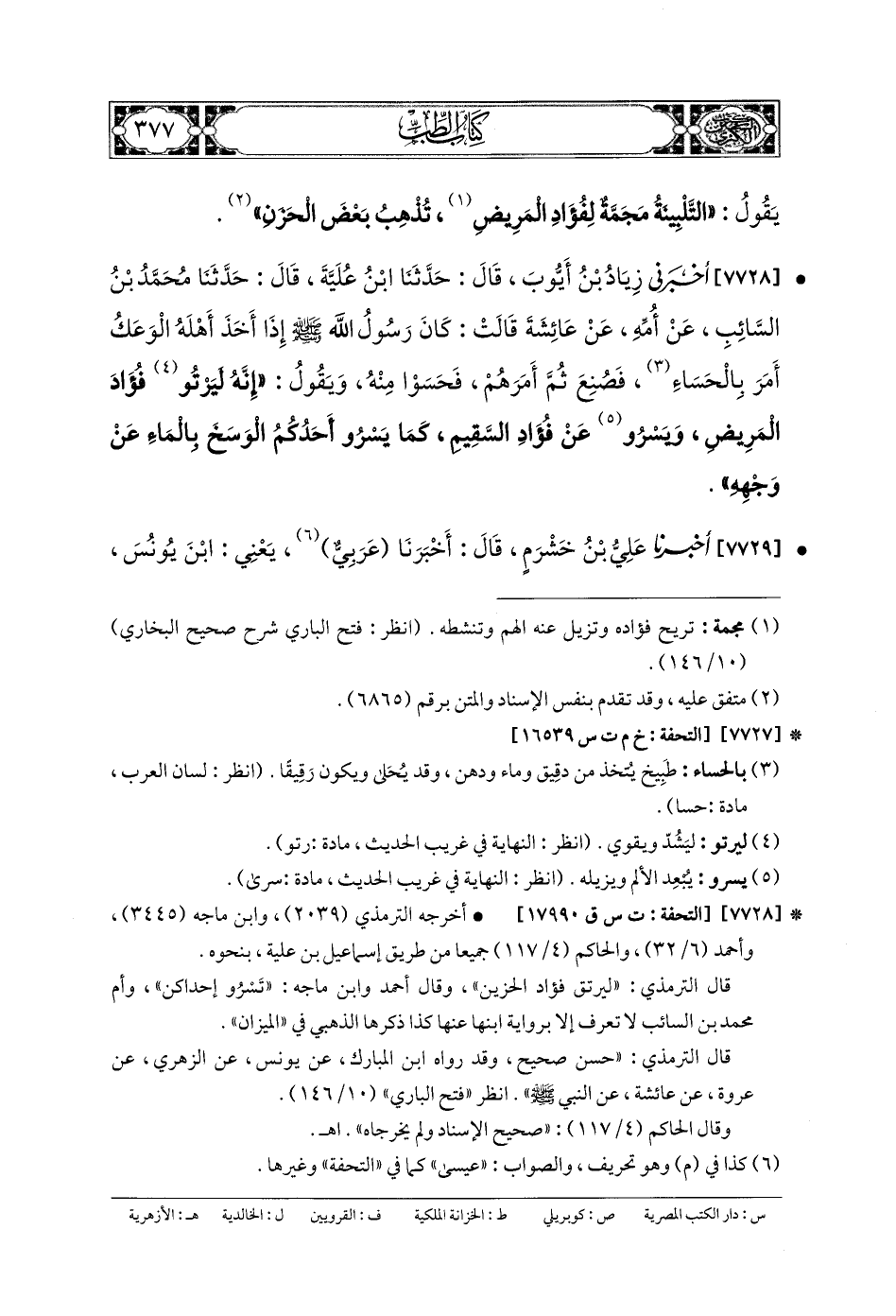 7728- أَخْبَرَنِي زِيَادُ بنُ أَيوبَ، قَالَ: حَدَّثنا ابْنُ عُلَيَّةَ، قَالَ: حَدَّثنا مُحَمدُ بنُ السَّائِبِ، عَن أُمِّهِ، عَن عَائِشَةَ، قَالَتْ: كَانَ رَسُولُ اللهِ صَلى الله عَلَيهِ وسَلم إِذَا أَخَذَ أَهْلَهُ الوَعَكُ أَمَرَ بِالحَسَاءِ فَصُنِعَ، ثُمَّ أَمَرَهُمْ فَحَسَوْا مِنْهُ، وَيَقُولُ: إِنَّهُ لَيَرْتُو فُؤَادَ المَرِيضِ، وَيَسْرُو عَن فُؤَادِ السَّقِيمِ، كَمَا يَسْرُو أَحَدُكُمُ الوَسَخَ بِالمَاءِ عَن وَجْهِهِ.