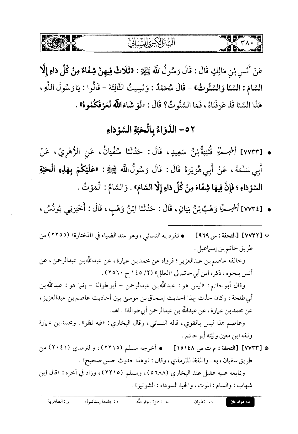 7733- أَخبَرنا قُتَيبَةُ بنُ سَعِيدٍ، قَالَ: حَدَّثنا سُفيانُ، عَنِ الزُّهْرِيِّ، عَن أَبي سَلَمَةَ، عَن أَبي هُرَيْرَةَ، قَالَ: قَالَ رَسُولُ اللهِ صَلى الله عَلَيهِ وسَلم: عَلَيْكُمْ بِهَذِهِ الحَبَّةِ السَّوْدَاءِ، فَإِنَّ فِيهَا شِفَاءً مِنْ كُلِّ دَاءٍ إِلاَّ السَّامَ، وَالسَّامُ: المَوْتُ.