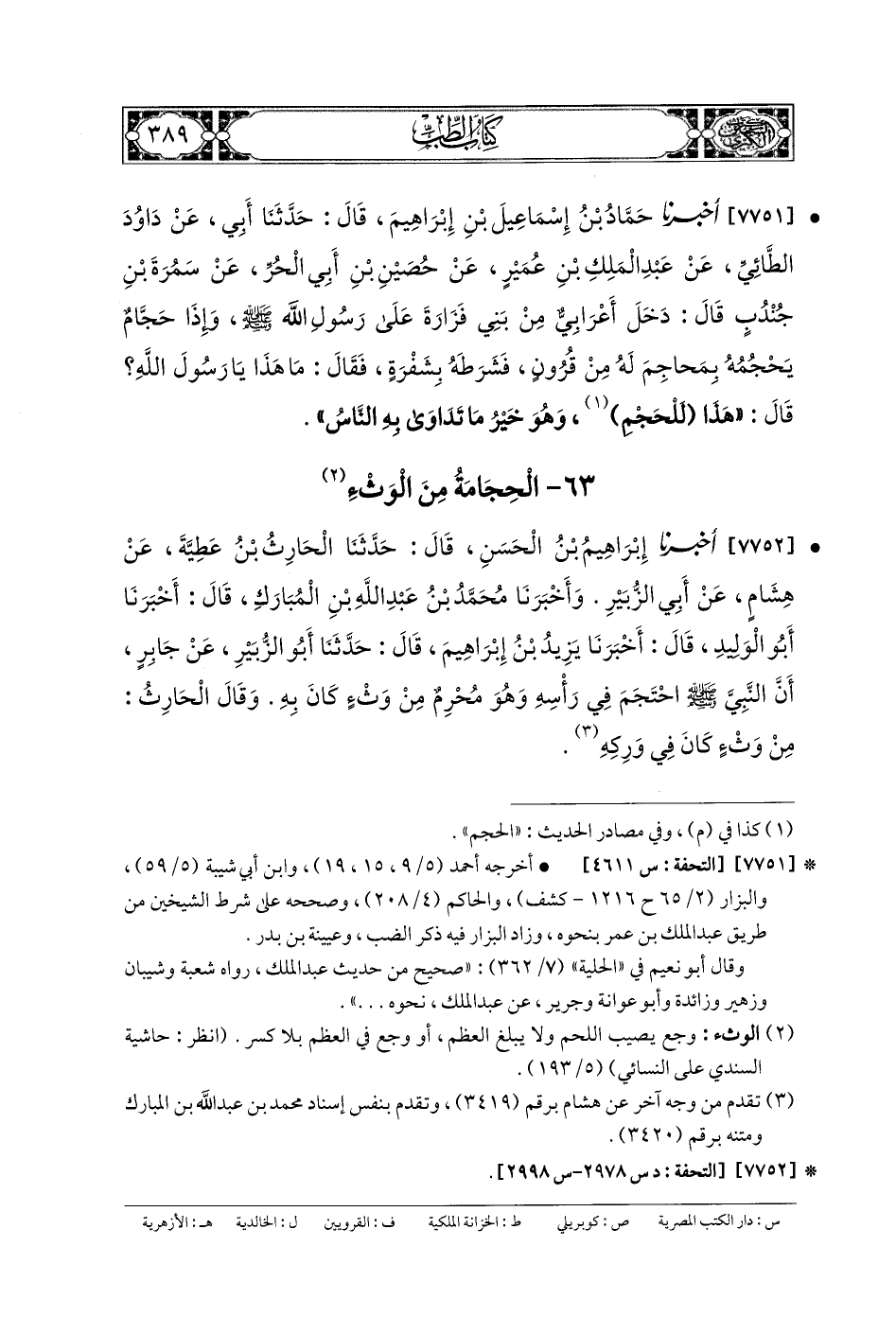 7751- أَخبَرنا حَمَّادُ بنُ إِسمَاعِيلَ بنِ إِبْرَاهِيمَ، قَالَ: حَدَّثنا أَبي، عَن دَاوُدَ الطَّائِيِّ، عَن عَبدِ المَلِكِ بنِ عُمَيْرٍ، عَن حُصَيْنِ بنِ أَبي الحُرِّ، عَن سَمُرَةَ بنِ جُنْدُبٍ، قَالَ: دَخَلَ أَعْرَابِيٌّ مِنْ بَنِي فَزَارَةَ عَلَى رَسُولِ اللهِ صَلى الله عَلَيهِ وسَلم، وَإِذَا حَجَّامٌ يَحْجُمُهُ بِمَحَاجِمَ لَهُ مِنْ قُرُونٍ، فَشَرَطَهُ بِشَفْرَةٍ، فَقَالَ: مَا هَذَا يَا رَسُولَ اللهِ؟ قَالَ: هَذَا الحَجْمُ (1)، وَهُوَ خَيْرُ مَا تَدَاوَى بِهِ النَّاسُ.