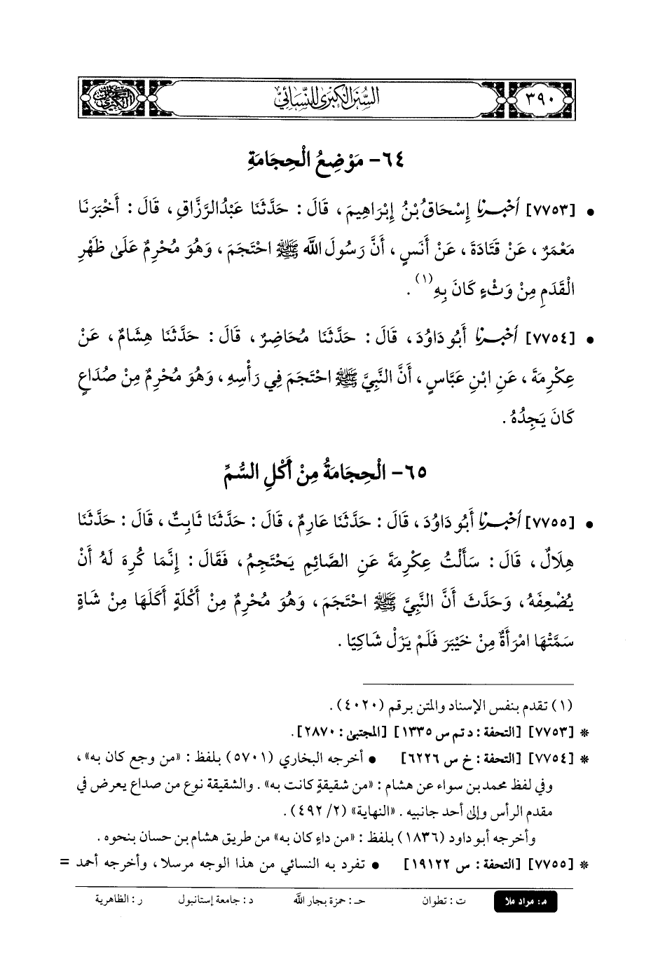 7753- أَخبَرنا إِسحَاقُ بنُ إِبْرَاهِيمَ، قَالَ: حَدَّثنا عَبدُ الرَّزَّاقِ، قَالَ: أَخبَرنا مَعْمَرٌ، عَن قَتَادَةَ، عَن أَنَسٍ، أَنَّ رَسُولَ اللهِ صَلى الله عَلَيهِ وسَلم احْتَجَمَ وَهُوَ مُحْرِمٌ عَلَى ظَهَرِ القَدَمِ مِنْ وَثْءٍ كَانَ بِهِ.