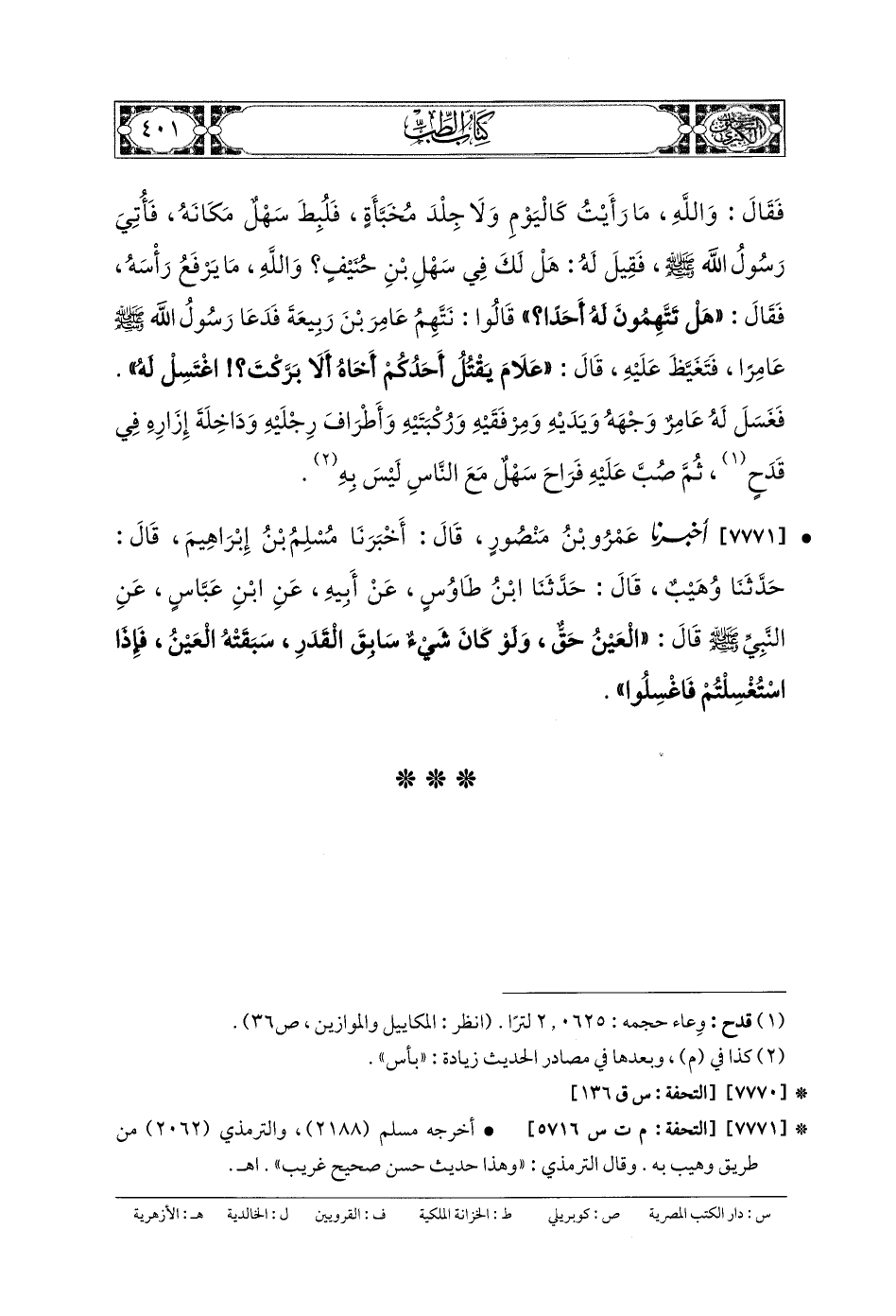 7771- أَخبَرنا عَمْرُو بنُ مَنْصُورٍ، قَالَ: أَخبَرنا مُسْلِمُ بنُ إِبْرَاهِيمَ، قَالَ: حَدَّثنا وُهَيْبٌ، قَالَ: حَدَّثنا ابْنُ طَاوُوسٍ، عَن أَبيهِ، عَنِ ابْنِ عَبَّاسٍ، عَنِ النَّبيِّ صَلى الله عَلَيهِ وسَلم قَالَ: العَيْنُ حَقٌّ، وَلَوْ كَانَ شَيْءٌ سَابَقَ القَدْرَ سَبَقَتْهُ العَيْنُ، فَإِذَا اسْتُغْسِلْتُمْ فَاغْسِلُوا.
