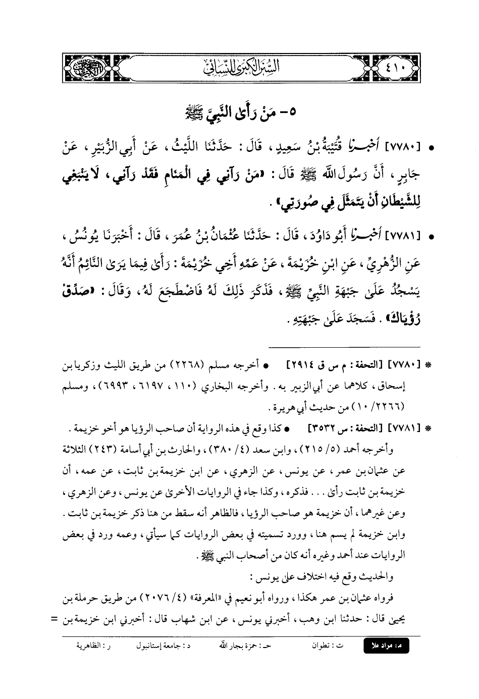 7780- أَخبَرنا قُتَيبَةُ بنُ سَعِيدٍ، قَالَ: حَدَّثنا اللَّيْثُ، عَن أَبي الزُّبَيْرِ، عَن جَابِرٍ، أَنَّ رَسُولَ اللهِ صَلى الله عَلَيهِ وسَلم قَالَ: مَنْ رَآنِي فِي المَنَامِ فَقَدْ رَآنِي، لا يَنْبَغِي لِلشَّيْطَانِ أَنْ يَتَمَثَّلَ فِي صُورَتِي.