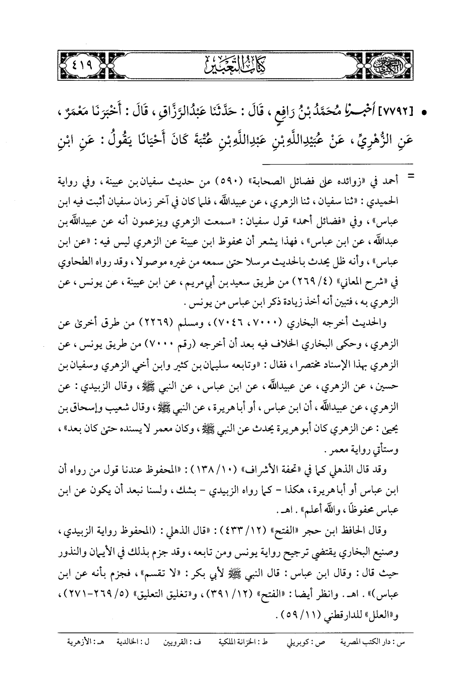 7792- أَخبَرنا مُحَمدُ بنُ رَافِعٍ، قَالَ: حَدَّثنا عَبدُ الرَّزَّاقِ، قَالَ: أَخبَرنا مَعْمَرٌ، عَنِ الزُّهْرِيِّ، عَن عُبَيْدِ اللهِ بنِ عَبدِ اللهِ بنِ عُتْبَةَ, كَانَ أَحْيَانًا يَقُولُ: عَنِ ابْنِ عَبَّاسٍ، وَأَحْيَانًا يَقُولُ: عَن أَبي هُرَيْرَةَ، أَنَّ رَجُلاً أَتَى رَسُولَ اللهِ صَلى الله عَلَيهِ وسَلم، وَسَاقَ الحَدِيثَ.