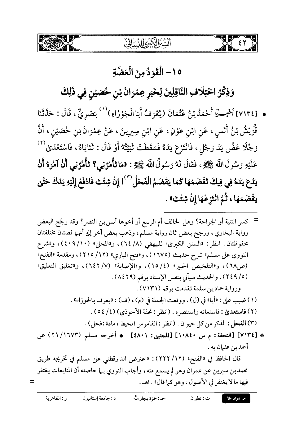 7134- أَخبَرنا أَحْمَدُ بنُ عُثْمَانَ يُعْرَفُ أَبَا الجَوْزَاءِ (1) بَصْرِيٌّ، قَالَ: حَدثنا قُرَيْشُ بنُ أَنَسٍ، عَنِ ابنِ عَوْنٍ، عَنِ ابنِ سِيرِينَ، عَن عِمْرَانَ بنِ حُصَيْنٍ، أَنَّ رَجُلاً عَضَّ يَدَ رَجُلٍ، فَانْتَزَعَ يَدَهُ، فَسَقَطَتْ ثَنِيَّتُهُ، أَوْ قَالَ: ثَنَايَاهُ، فَاسْتَعْدَى عَلَيْهِ رَسُولُ اللهِ صَلى الله عَلَيهِ وسَلم، فَقَالَ لَهُ رَسُولُ اللهِ صَلى الله عَلَيهِ وسَلم: مَا تَأْمُرُنِي؟ تَأْمُرُنِي أَنْ آمُرَهُ أَنْ يَدَعَ يَدَهُ فِي فِيكَ، تَقْضَمُهَا كَمَا يَقْضَمُ الفَحْلُ، إِنْ شِئْتَ فَادْفَعْ إِلَيْهِ يَدَكَ حَتَّى يَقْضَمَهَا، ثُمَّ انْتَزِعْهَا إِنْ شِئْتَ.
