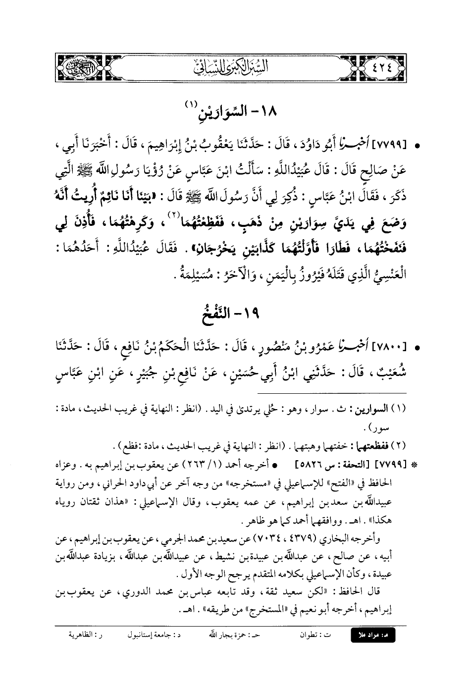 7800- أَخبَرنا عَمْرُو بنُ مَنْصُورٍ، قَالَ: حَدَّثنا الحَكَمُ بنُ نَافِعٍ، قَالَ: حَدَّثنا شُعَيْبٌ، قَالَ: حَدَّثني ابْنُ أَبي حُسَيْنٍ، عَن نَافِعِ بنِ جُبَيْرٍ، عَنِ ابْنِ عَبَّاسٍ، قَالَ: أَخْبَرَنِي أَبو هُرَيْرَةَ، أَنَّ النَّبيَّ صَلى الله عَلَيهِ وسَلم قَالَ: بَيْنَا أَنَا نَائِمٌ رَأَيْتُ فِي يَدِي سِوَارَيْنِ مِنْ ذَهَبٍ، فَأَهَمَّنِي شَأْنُهُمَا، فَأَوْحَى اللهُ إِلَيَّ فِي المَنَامِ: أَنْفُخَهُمَا، فَنَفَخْتُهُمَا, فَطَارَا، فَأَوَّلْتُهُمَا كَذَّابَيْنِ يَخْرُجَانِ بَعْدِي, وَكَانَ أَحَدُهُمَا العَنسِيَّ, صَاحِبَ صَنْعَاءَ، وَالآخَرُ مُسَيْلِمَةُ, صَاحِبُ اليَمَامَةِ.