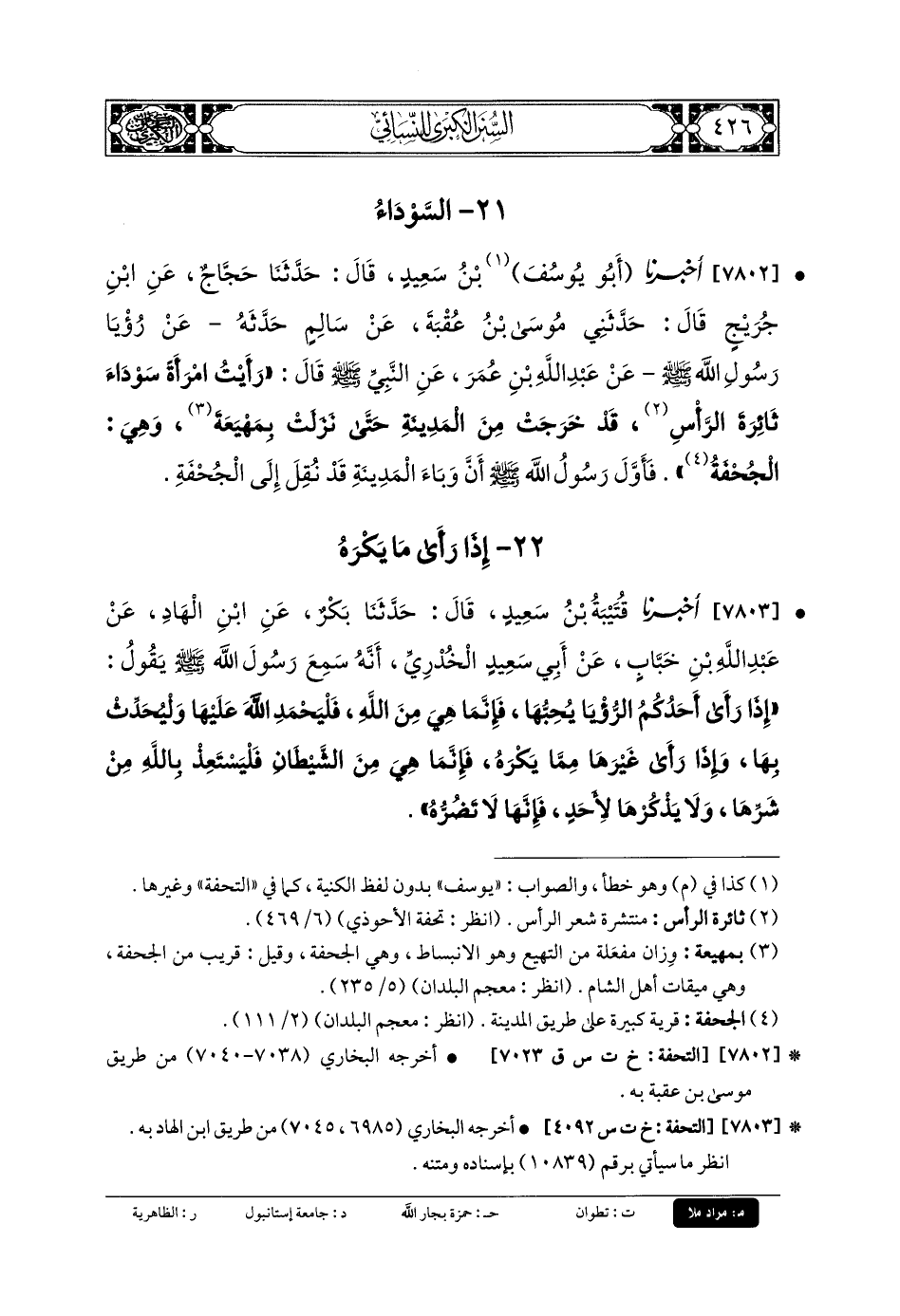 7802- أَخبَرنا يُوسُفَ (1) بنُ سَعِيدٍ، قَالَ: حَدَّثنا حَجَّاجٌ، عَنِ ابْنِ جُرَيْجٍ، قَالَ: حَدَّثني مُوسَى بنُ عُقْبَةَ، عَن سَالِمٍ حَدَّثَهُ عَن رُؤْيَا رَسُولِ اللهِ صَلى الله عَلَيهِ وسَلم، عَن عَبدِ اللهِ بنِ عُمَرَ، عَنِ النَّبيِّ صَلى الله عَلَيهِ وسَلم قَالَ: رَأَيْتُ امْرَأَةً سَوْدَاءَ ثَائِرَةَ الرَّأْسِ قَدْ خَرَجَتْ مِنَ المَدِينَةِ، حَتَّى نَزَلَتْ بِمَهْيَعَةَ، وَهِيَ الجُحْفَةُ، فَأَوَّلَ رَسُولُ اللهِ صَلى الله عَلَيهِ وسَلم أَنَّ وَبَاءَ المَدِينَةِ قَدْ نُقِلَ إِلَى الجُحْفَةِ.