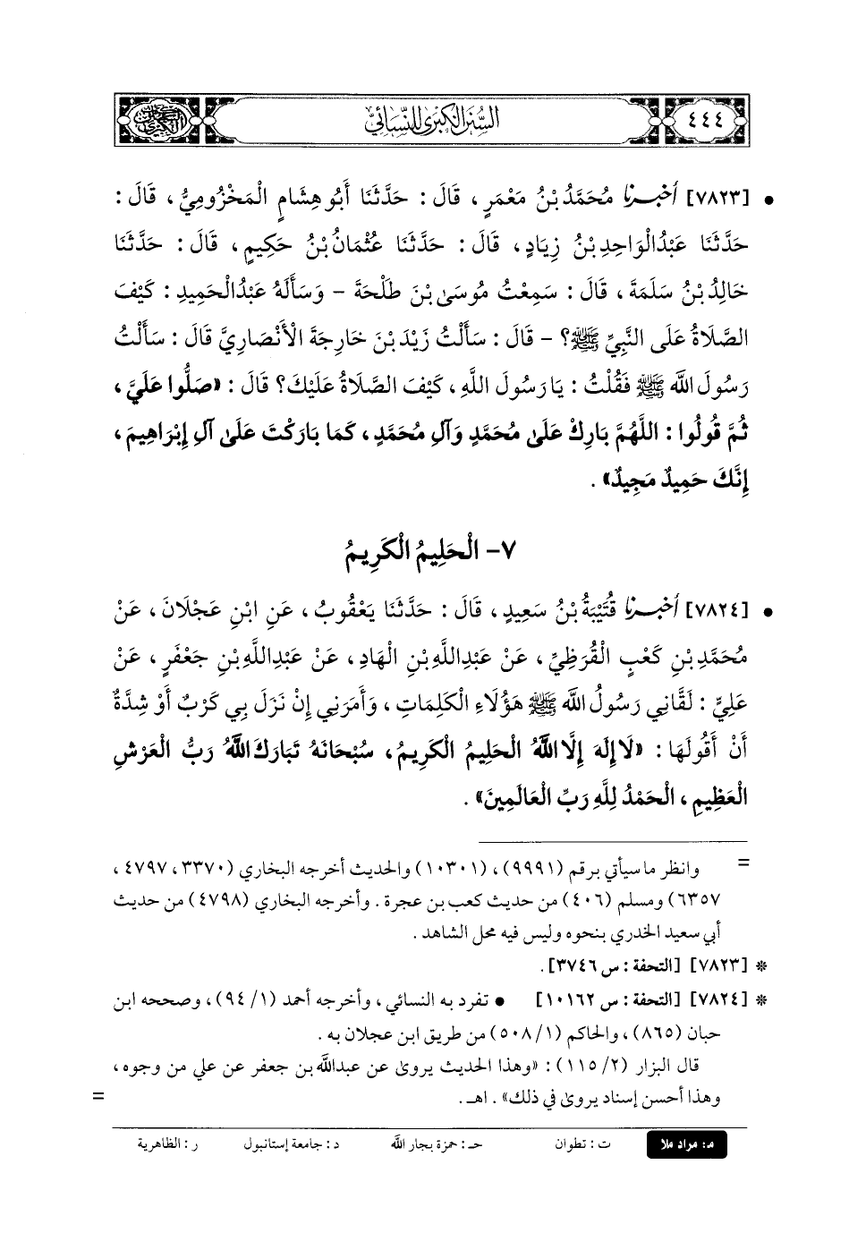 7824- أَخبَرنا قُتَيبَةُ بنُ سَعِيدٍ، قَالَ: حَدَّثنا يَعْقُوبُ، عَنِ ابْنِ عَجْلانَ، عَن مُحَمدِ بنِ كَعْبٍ القُرَظِيِّ، عَن عَبدِ اللهِ بنِ الهَادِ، عَن عَبدِ اللهِ بنِ جَعْفَرٍ، عَن عَليٍّ، لَقَّانِي رَسُولُ اللهِ صَلى الله عَلَيهِ وسَلم هَؤُلاءِ الكَلِمَاتِ، وَأَمَرَنِي إِنْ نَزَلَ بِي كَرْبٌ (1) أَوْ شِدَّةٌ أَنْ أَقُولَهَا: لا إِلَهَ إِلاَّ اللهُ الحَلِيمُ الكَرِيمُ، سُبْحَانَهُ تَبَارَكَ اللهُ رَبُّ العَرْشِ العَظِيمِ، الحَمْدُ للهِ رَبِّ العَالَمِينَ.