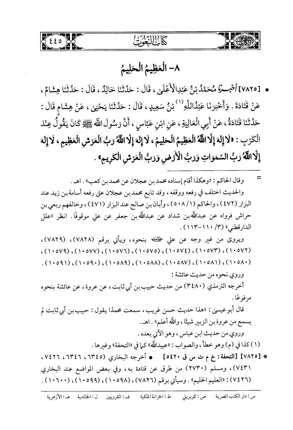 7825- أَخبَرنا مُحَمدُ بنُ عَبدِ الأَعْلَى، قَالَ: حَدَّثنا خَالِدٌ، قَالَ: حَدَّثنا هِشَامٌ، عَن قَتَادَةَ (ح) وَأَخبَرنا عَبدُ اللهِ بنُ سَعِيدٍ، قَالَ: حَدَّثنا يَحْيَى، عَن هِشَامٍ، قَالَ: حَدَّثنا قَتَادَةُ، عَن أَبي العَالِيَةِ، عَنِ ابْنِ عَبَّاسٍ، أَنَّ رَسُولَ اللهِ صَلى الله عَلَيهِ وسَلم كَانَ يَقُولُ عِنْدَ الكَرْبِ: لا إِلَهَ إِلاَّ اللهُ العَظِيمُ الحَلِيمُ، لا إِلَهَ إِلاَّ اللهُ رَبُّ العَرْشِ العَظِيمِ، لا إِلَهَ إِلاَّ اللهُ رَبُّ السَّمَاوَاتِ وَرَبُّ الأَرْضِ وَرَبُّ العَرْشِ الكَرِيمِ.