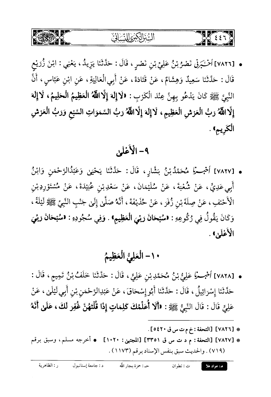 7826- أَخبَرنِي نَصْرُ بنُ عَليِّ بنِ نَصْرٍ، قَالَ: حَدَّثنا يَزِيدُ، يَعْنِي ابْنَ زُرَيْعٍ، قَالَ: حَدَّثنا سَعِيدٌ، وَهِشَامٌ، عَن قَتَادَةَ، عَن أَبي العَالِيَةِ، عَنِ ابْنِ عَبَّاسٍ، أَنَّ النَّبيَّ صَلى الله عَلَيهِ وسَلم كَانَ يَدْعُو بِهِنَّ عِنْدَ الكَرْبُ: لا إِلَهَ إِلاَّ اللهُ العَظِيمُ الحَلِيمُ، لا إِلَهَ إِلاَّ اللهُ رَبُّ العَرْشِ العَظِيمِ، لا إِلَهَ إِلاَّ اللهُ رَبُّ السَّمَاوَاتِ السَّبْعِ وَرَبُّ العَرْشِ الكَرِيمِ.