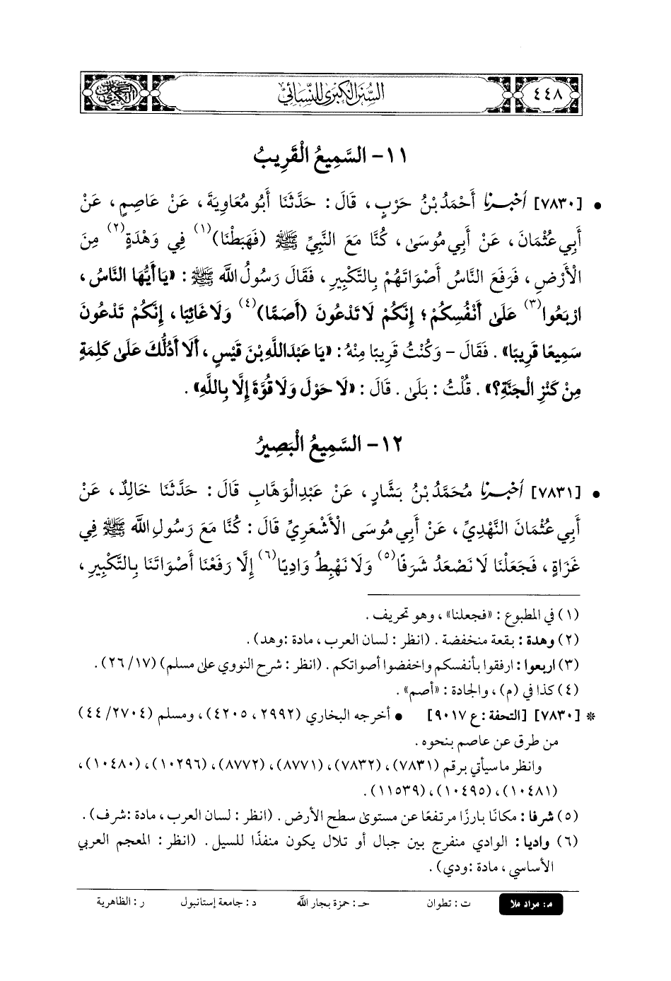 7830- أَخبَرنا أَحْمَدُ بنُ حَرْبٍ، قَالَ: حَدَّثنا أَبو مُعاويَةَ، عَن عَاصِمٍ، عَن أَبي عُثْمَانَ، عَن أَبي مُوسَى، كُنَّا مَعَ النَّبيِّ صَلى الله عَلَيهِ وسَلم فَهَبَطْنَا فِي وَهْدَةٍ مِنَ الأَرْضِ، فَرَفَعَ النَّاسُ أَصْوَاتَهُمْ بِالتَّكْبِيرِ، فَقَالَ رَسُولُ اللهِ صَلى الله عَلَيهِ وسَلم: يَا أَيُّهَا النَّاسُ، ارْبَعُوا عَلَى أَنْفُسِكُمْ؛ إِنَّكُمْ لا تَدْعُونَ أَصَمًّا، وَلا غَائِبًا، إِنَّكُمْ تَدْعُونَ سَمِيعًا قَرِيبًا، فَقَالَ, وَكُنْتُ قَرِيبًا مِنْهُ: يَا عَبدَ اللهِ بْنَ قَيْسٍ، أَلا أَدُلُّكُ عَلَى كَلِمَةٍ مِنْ كَنْزِ الجَنَّةِ؟ قُلْتُ: بَلَى، قَالَ: لا حَوْلَ وَلا قُوَّةَ إِلاَّ بِاللَّهِ.