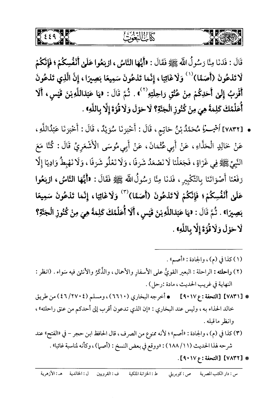 7832- أَخبَرنا مُحَمدُ بنُ حَاتِمٍ، قَالَ: أَخبَرنا سُوَيْدٌ، قَالَ: أَخبَرنا عَبدُ اللهِ، عَن خَالِدٍ الحَذَّاءِ، عَن أَبي عُثْمَانَ، عَن أَبي مُوسَى الأَشْعَرِيِّ، قَالَ: كُنَّا مَعَ النَّبيِّ صَلى الله عَلَيهِ وسَلم فِي غَزَاةٍ، فَجَعَلْنَا لا نَصْعَدُ شَرَفًا، وَلا نَعْلُو شَرَفًا، وَلا نَهْبِطُ وَادِيًا، إِلاَّ رَفَعْنَا أَصْوَاتَنَا بِالتَّكْبِيرِ، فَدَنَا مِنَّا رَسُولُ اللهِ صَلى الله عَلَيهِ وسَلم فَقَالَ: أَيُّهَا النَّاسُ، ارْبَعُوا عَلَى أَنْفُسِكُمْ، فَإِنَّكُمْ لا تَدْعُونَ أَصَمًّا, وَلا غَائِبًا، إِنَّمَا تَدَعُونَ سَمِيعًا بَصِيرًا، ثُمَّ قَالَ: يَا عَبدَ اللهِ بْنَ قَيْسٍ، أَلا أُعَلِّمُكَ كَلِمَةً هِيَ مِنْ كُنُوزِ الجَنَّةِ: لا حَوْلَ وَلا قُوَّةَ إِلاَّ بِاللَّهِ.