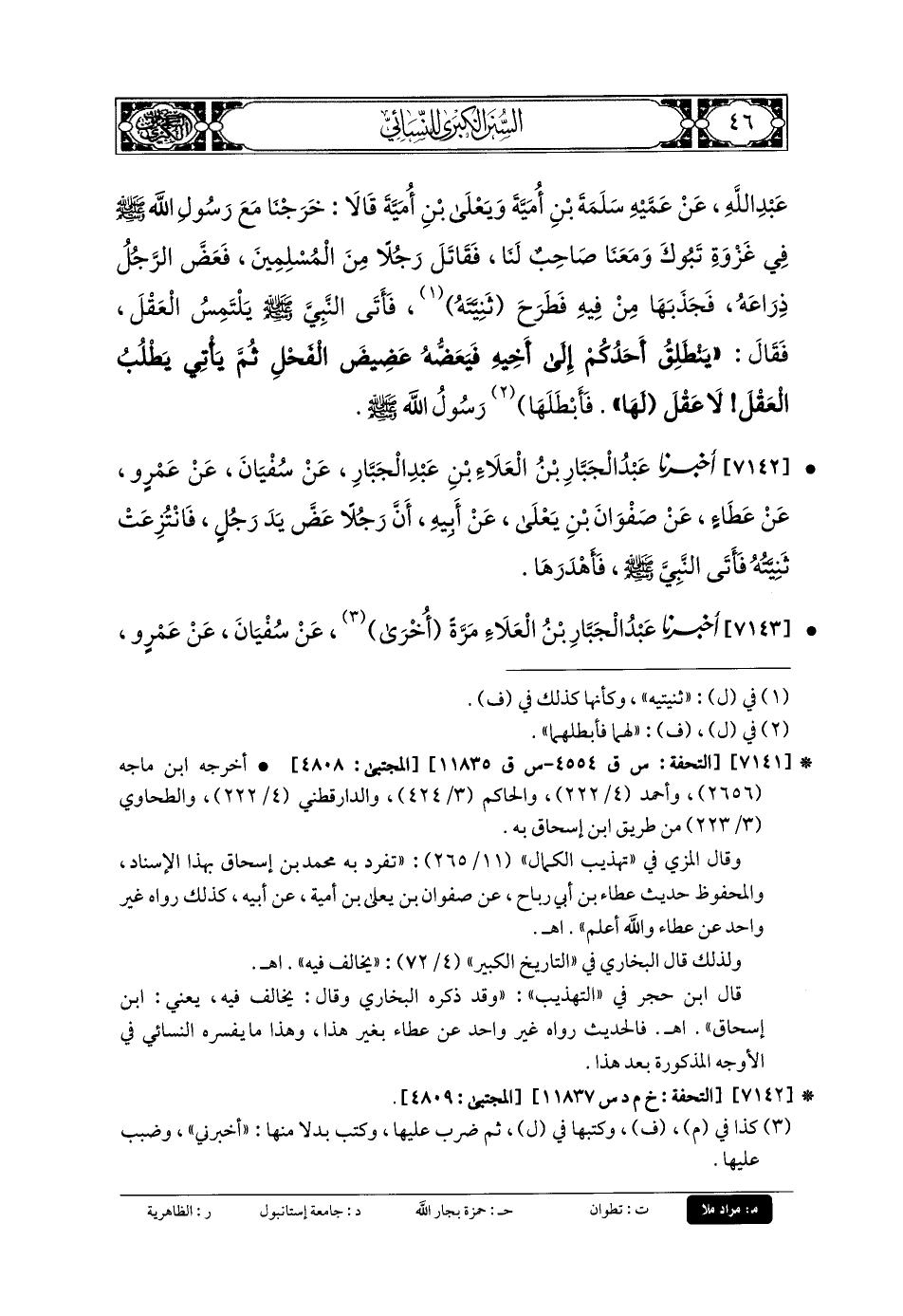 7142- أَخبَرنا عَبدُ الجَبَّارِ بنُ العَلاءِ بنِ عَبدِ الجَبَّارِ، عَن سُفيانَ، عَن عَمْرٍو، عَن عَطَاءٍ، عَن صَفْوَانَ بنِ يَعْلَى، عَن أَبيهِ، أَنَّ رَجُلاً عَضَّ يَدَ رَجُلٍ، فَانْتُزِعَتْ ثَنِيَّتُهُ، فَأَتَى النَّبيَّ صَلى الله عَلَيهِ وسَلم، فَأَهْدَرَهَا.
