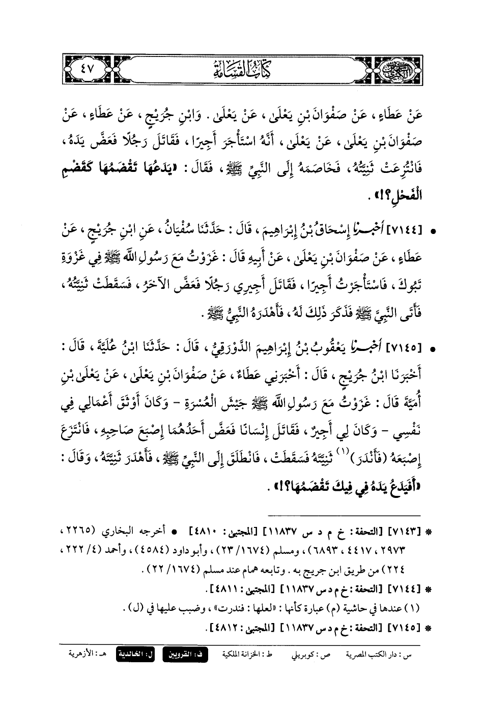 7145- أَخبَرنا يَعقُوبُ بنُ إِبرَاهِيمَ الدَّوْرَقِيُّ، قَالَ: حَدثنا ابنُ عُلَيَّةَ، قَالَ: أَخبَرنا ابنُ جُرَيْجٍ، قَالَ: أَخبَرني عَطَاءٌ، عَن صَفْوَانَ بنِ يَعْلَى، عَن يَعْلَى بنِ أُمَيَّةَ، قَالَ: غَزَوْتُ مَعَ رَسُولِ اللهِ جَيْشَ العُسْرَةِ، وَكَانَ أَوْثَقَ أَعْمَالِي فِي نَفْسِي، وَكَانَ لِي أَجِيرٌ، فَقَاتَلَ إِنْسَانًا، فَعَضَّ أَحَدُهُمَا إِصْبَعَ صَاحِبِهِ، فَانْتَزَعَ إِصْبَعَهُ، فَأَنْدَرَ ثَنِيَّتَهُ فَسَقَطَتْ، فَانْطَلَقَ إِلَى النَّبيِّ صَلى الله عَلَيهِ وسَلم، فَأَهْدَرَ ثَنِيَّتَهُ، وَقَالَ: أَفَيَدَعُ يَدَهُ فِي فِيكَ تَقْضَمُهَا؟.