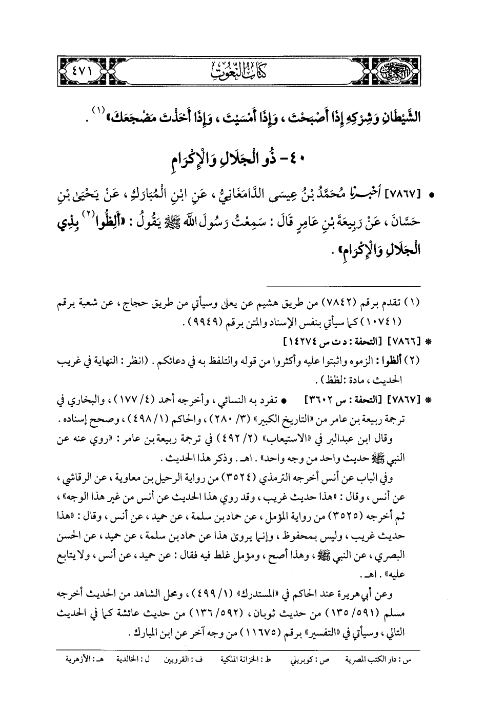 7867- أَخبَرنا مُحَمدُ بنُ عِيسَى الدامغاني، عَنِ ابْنِ المُبَارَكِ، عَن يَحْيَى بنِ حَسَّانَ، عَن رَبِيعَةَ بنِ عَامِرٍ، قَالَ: سَمِعْتُ رَسُولَ اللهِ صَلى الله عَلَيهِ وسَلم يَقُولُ: أَلِظُّوا بِذِي الجَلالِ وَالإِكْرَامِ.