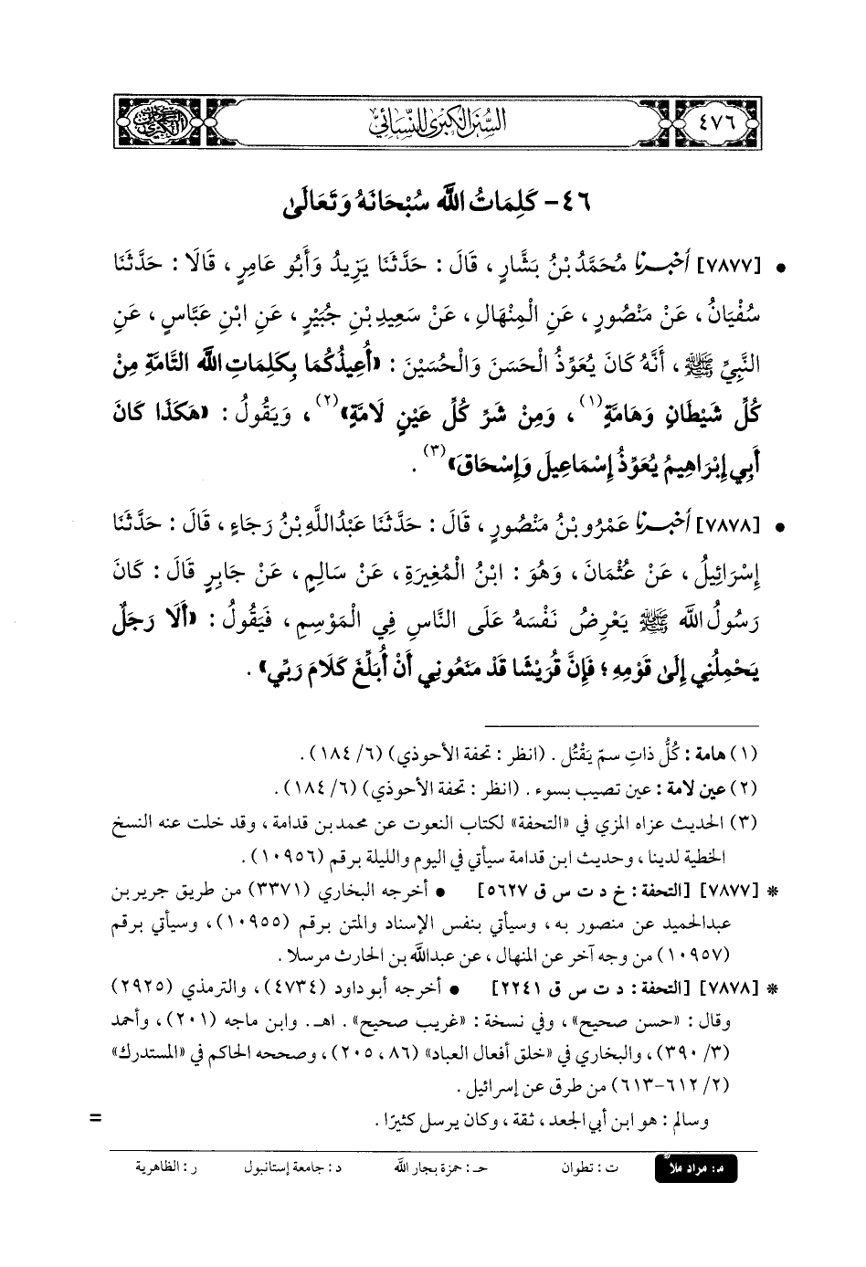 7877- أَخبَرنا مُحَمدُ بنُ بَشَّارٍ، قَالَ: حَدَّثنا يَزِيدُ، وَأَبو عَامِرٍ، قَالاَ: حَدَّثنا سُفيانُ، عَن مَنْصُورٍ، عَنِ المِنْهَالِ، عَن سَعِيدِ بنِ جُبَيْرٍ، عَنِ ابْنِ عَبَّاسٍ، عَنِ النَّبيِّ صَلى الله عَلَيهِ وسَلم، أَنَّهُ كَانَ يُعَوِّذُ الحَسَنَ وَالحُسَيْنَ: أُعِيذُكُمَا بِكَلِمَاتِ اللهِ التَّامَّةِ، مِنْ كُلِّ شَيْطَانٍ وَهَامَّةٍ، وَمِنْ شَرِّ كُلِّ عَيْنٍ لامَّةٍ، وَيَقُولُ: هَكَذَا كَانَ أَبي إِبْرَاهِيمُ يُعَوِّذُ إِسمَاعِيلَ وَإِسحَاقَ.