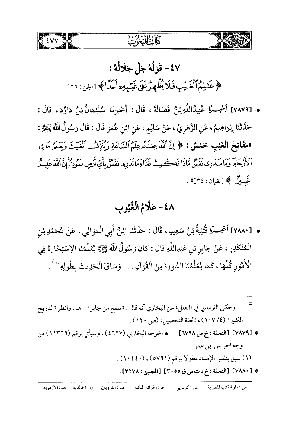 7879- أَخبَرنا عُبَيْدُ اللهِ بنُ فَضَالَةَ، قَالَ: أَخبَرنا سُلَيْمَانُ بنُ دَاوُدَ، قَالَ: حَدَّثنا إِبْرَاهِيمُ، عَنِ الزُّهْرِيِّ، عَن سَالِمٍ، عَنِ ابْنِ عُمَرَ، قَالَ: قَالَ رَسُولُ اللهِ صَلى الله عَلَيهِ وسَلم: مَفَاتِحُ الغَيْبِ خَمْسٌ: {إِنَّ اللهَ عِنْدَهُ عِلْمُ السَّاعَةِ وَيُنَزِّلُ الغَيْثَ وَيَعْلَمُ مَا فِي الأَرْحَامِ وَمَا تَدْرِي نَفْسٌ مَاذَا تَكْسِبُ غَدًا وَمَا تَدْرِي نَفْسٌ بِأَيِّ أَرْضٍ تَمُوتُ إِنَّ اللهَ عَليمٌ خَبِيرٌ}.
