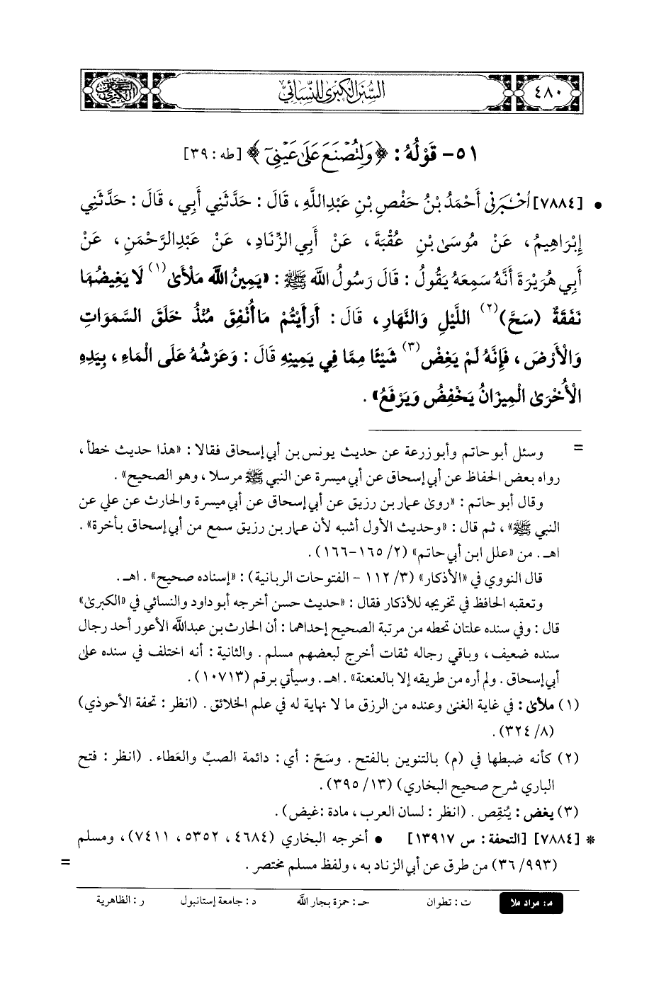 7884- أَخْبَرَنِي أَحْمَدُ بنُ حَفْصِ بنِ عَبدِ اللهِ، قَالَ: حَدَّثني أَبي، قَالَ: حَدَّثني إِبْرَاهِيمُ، عَن مُوسَى بنِ عُقْبَةَ، عَن أَبي الزِّنَادِ، عَن عَبدِ الرَّحمَنِ، عَن أَبي هُرَيْرَةَ، أَنَّهُ سَمِعَهُ يَقُولُ: قَالَ رَسُولُ اللهِ صَلى الله عَلَيهِ وسَلم: يَمِينُ اللهِ مَلأَى, لا يَغِيضُهَا نَفَقَةٌ, سَحَّ اللَّيْلِ وَالنَّهَارِ، قَالَ: أَرَأَيْتُمْ مَا أُنْفِقَ مُنْذُ خَلَقَ السَّمَاوَاتِ وَالأَرْضَ؟ فَإِنَّهُ لَمْ يَغِضْ شَيْئًا مِمَّا فِي يَمِينِهِ، قَالَ: وَعَرْشُهُ عَلَى المَاءِ بِيَدِهِ الأُخْرَى، المِيزَانُ يَخْفِضُ وَيَرْفَعُ.