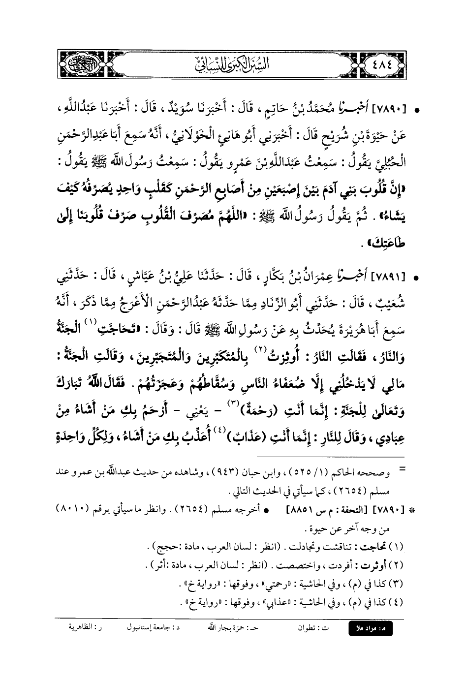 7890- أَخبَرنا مُحَمدُ بنُ حَاتِمٍ، قَالَ: أَخبَرنا سُوَيْدٌ، قَالَ: أَخبَرنا عَبدُ اللهِ، عَن حَيْوَةَ بنِ شُرَيْحٍ، قَالَ: أَخْبَرَنِي أَبو هَانِئٍ الخَوْلانِيُّ، أَنَّهُ سَمِعَ أَبَا عَبدِ الرَّحمَنِ الحُبُلِيَّ يَقُولُ: سَمِعْتُ عَبدَ اللهِ بْنَ عَمْرٍو يَقُولُ: سَمِعْتُ رَسُولَ اللهِ صَلى الله عَلَيهِ وسَلم يَقُولُ: إِنَّ قُلُوبَ بَنِي آدَمَ بَيْنَ إِصْبَعَيْنِ مِنْ أَصَابِعِ الرَّحمَنِ كَقَلْبٍ وَاحِدٍ، يُصَرِّفُهُ كَيْفَ يَشَاءُ، ثُمَّ يَقُولُ رَسُولُ اللهِ صَلى الله عَلَيهِ وسَلم: اللهُمَّ مُصَرِّفَ القُلُوبِ، صَرِّفْ قُلُوبَنَا إِلَى طَاعَتِكَ.