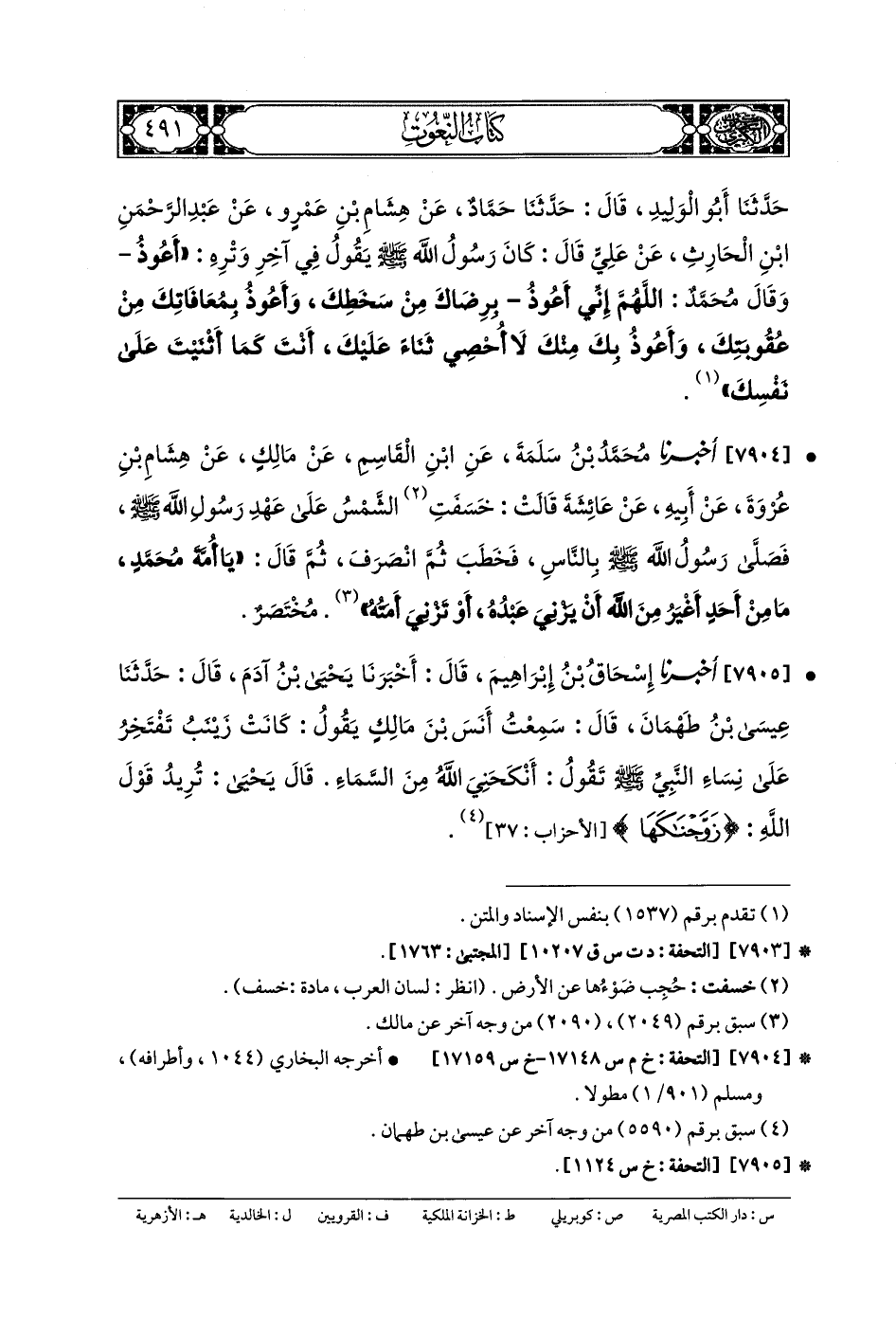 7904- أَخبَرنا مُحَمدُ بنُ سَلَمَةَ، عَنِ ابْنِ القَاسِمِ، عَن مَالِكٍ، عَن هِشَامِ بنِ عُرْوَةَ، عَن أَبيهِ، عَن عَائِشَةَ، قَالَتْ: خَسَفَتِ الشَّمْسُ عَلَى عَهْدِ رَسُولِ اللهِ صَلى الله عَلَيهِ وسَلم، فَصَلَّى رَسُولُ اللهِ صَلى الله عَلَيهِ وسَلم بِالنَّاسِ, فَخَطَبَ، ثُمَّ انْصَرَفَ، ثُمَّ قَالَ: يَا أُمَّةَ مُحَمدٍ، مَا مِنْ أَحَدٍ أَغْيَرُ مِنَ اللهِ أَنْ يَزْنِيَ عَبدُهُ, أَوِ تَزْنِيَ أَمَتُهُ، مُخْتَصَرٌ.