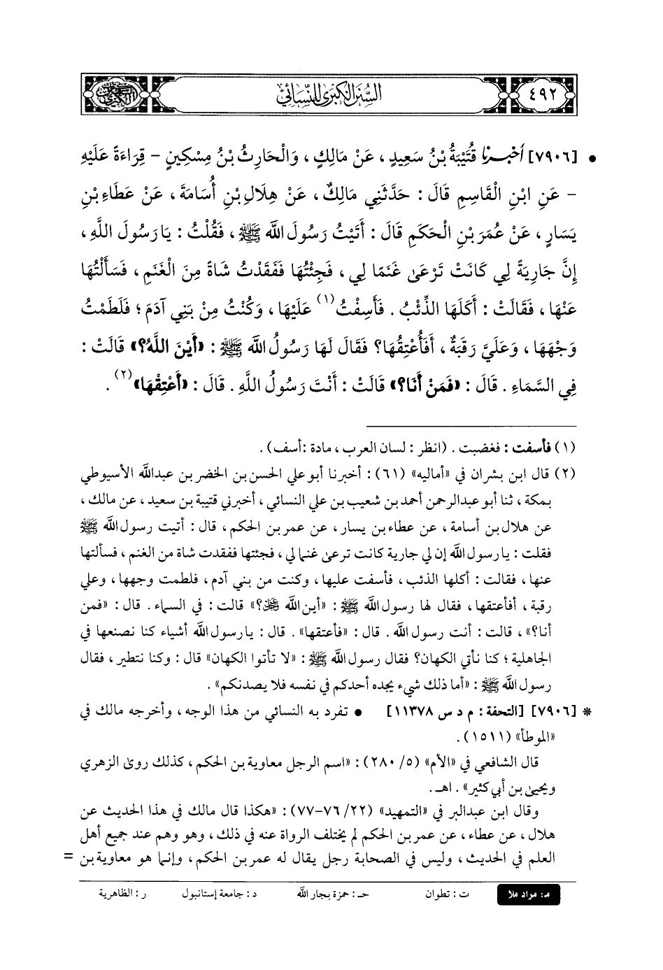 7906- أَخبَرنا قُتَيبَةُ بنُ سَعِيدٍ، عَن مَالِكٍ. وَالحَارِثِ بنِ مِسْكِينٍ، قِرَاءَةً عَلَيْهِ، عَنِ ابْنِ القَاسِمِ، قَالَ: حَدَّثني مَالِكٌ، عَن هِلالِ بنِ أُسَامَةَ، عَن عَطَاءِ بنِ يَسَارٍ، عَن عُمَرَ بنِ الحَكَمِ، قَالَ: أَتَيْتُ رَسُولَ اللهِ صَلى الله عَلَيهِ وسَلم فَقُلْتُ: يَا رَسُولَ اللهِ، إِنَّ جَارِيَةً لِي كَانَتْ تَرْعَى غَنَمًا لِي، فَجِئْتُهَا, فَفَقَدْتُ شَاةً مِنَ الغَنَمِ، فَسَأَلْتُهَا عَنهَا، فَقَالَتْ: أَكْلَهَا الذِّئْبُ, فَأَسِفْتُ عَلَيْهَا، وَكُنْتُ مِنْ بَنِي آدَمَ، فَلَطَمْتُ وَجْهَهَا، وَعَلَيَّ رَقَبَةٌ, أَفأُعْتِقُهَا؟ فَقَالَ لَهَا رَسُولُ اللهِ صَلى الله عَلَيهِ وسَلم: أَيْنَ اللهُ؟ قَالَتْ: فِي السَّمَاءِ، قَالَ: فَمَنْ أَنَا؟ قَالَتْ: أَنْتَ رَسُولُ اللهِ، قَالَ: أَعْتِقْهَا.