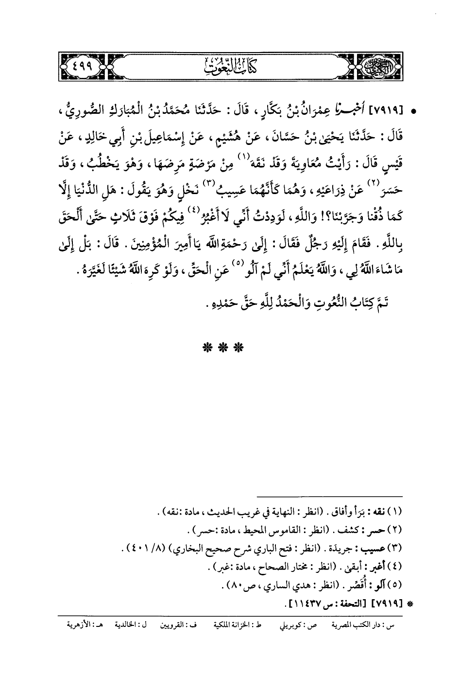 7919 - أَخبَرنا عِمْرَانُ بنُ بَكَّارٍ، قَالَ: حَدَّثنا مُحَمدُ بنُ المُبَارَكِ الصُّورِيُّ، قَالَ: حَدَّثنا يَحْيَى بنُ حَسَّانَ، عَن هُشَيْمٍ، عَن إِسمَاعِيلَ بنِ أَبي خَالِدٍ، عَن قَيْسٍ، قَالَ: رَأَيْتُ مُعاويَةَ وَقَدْ نَقَهَ مِنْ مَرْضَةٍ مَرِضَهَا وَهُوَ يَخْطُبُ، وَقَدْ حَسَرَ عَن ذِرَاعَيْهِ، وَهُمَا كَأَنَّهُمَا عَسِيبُ نَخْلٍ، وَهُوَ يَقُولُ: هَلِ الدُّنْيَا إِلاَّ كَمَا ذُقْنَا وَجَرَّبْنَا؟ وَاللهِ لَوَدِدْتُ أَنِّي لا أَغْبُرُ فِيكُمْ فَوْقَ ثَلاثٍ, حَتَّى أَلْحَقَ بِاللهِ، فَقَامَ إِلَيْهِ رَجُلٌ فَقَالَ: إِلَى رَحْمَةِ اللهِ يَا أَمِيرَ المُؤْمِنِينَ، قَالَ: بَلْ إِلَى مَا شَاءَ اللهُ لِي، وَاللهُ يَعْلَمُ أَنِّي لَمْ آلُو عَنِ الحَقِّ، وَلَوْ كَرِهَ اللهُ شَيْئًا لَغَيَّرَهُ.