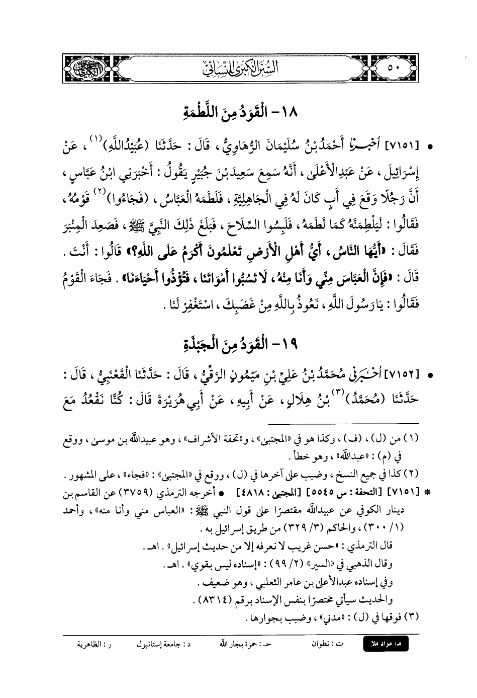 7151- أَخبَرنا أَحْمَدُ بنُ سُلَيمَانَ الرُّهَاوِيُّ، قَالَ: حَدثنا عُبَيدُ اللهِ، عَن إِسرَائِيلَ، عَن عَبدِ الأَعْلَى، أَنَّهُ سَمِعَ سَعِيدَ بْنَ جُبَيرٍ يَقُولُ: أَخبَرني ابنُ عَبَّاسٍ، أَنَّ رَجُلاً وَقَعَ فِي أَبٍ كَانَ لَهُ فِي الجَاهِلِيَّةِ، فَلَطَمَهُ العَبَّاسُ، فَجَاءَ قَوْمَهُ، فَقَالُوا: لَيَلْطِمَنَّهُ كَمَا لَطَمَهُ، فَلَبِسُوا السِّلاحَ، فَبَلَغَ ذَلِكَ النَّبيَّ صَلى الله عَلَيهِ وسَلم، فَصَعِدَ المِنْبَرَ، فَقَالَ: أَيُّهَا النَّاسُ، أَيُّ أَهْلِ الأَرْضِ تَعْلَمُونَ أَكْرَمُ عَلَى اللهِ؟ قَالُوا: أَنْتَ، قَالَ: فَإِنَّ العَبَّاسَ مِنِّي، وَأَنَا مِنْهُ، لا تَسُبُّوا أَمْوَاتَنَا، فَتُؤْذُوا أَحْيَاءَنَا، فَجَاءَ القَوْمُ، فَقَالُوا: يَا رَسُولَ اللهِ، نَعُوذُ بِاللهِ مِنْ غَضَبِكَ، اسْتَغْفِرْ لَنَا.