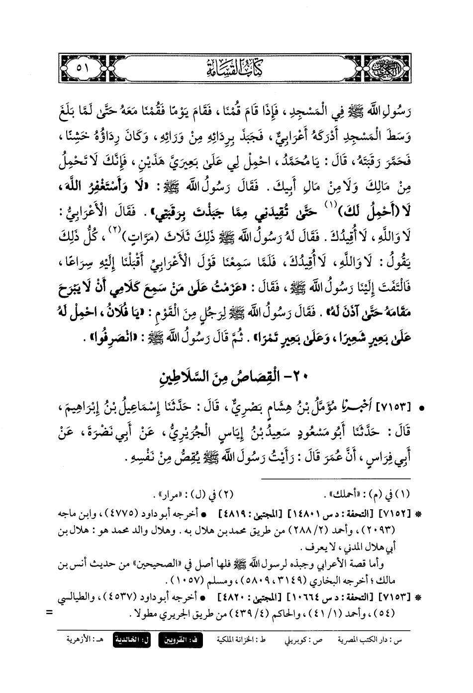 7153- أَخبَرنا مُؤَمَّلُ بنُ هِشَامٍ، بَصَرِيٌّ، قَالَ: حَدثنا إِسمَاعِيلُ بنُ إِبرَاهِيمَ، قَالَ: حَدثنا أَبو مَسْعُودٍ سَعِيدُ بنُ إِيَاسٍ الجُرَيْرِيُّ، عَن أَبي نَضْرَةَ، عَن أَبي فِرَاسٍ، أَنَّ عُمَرَ قَالَ: رَأَيْتُ رَسُولَ اللهِ صَلى الله عَلَيهِ وسَلم يُقِصُّ مِنْ نَفْسِهِ.