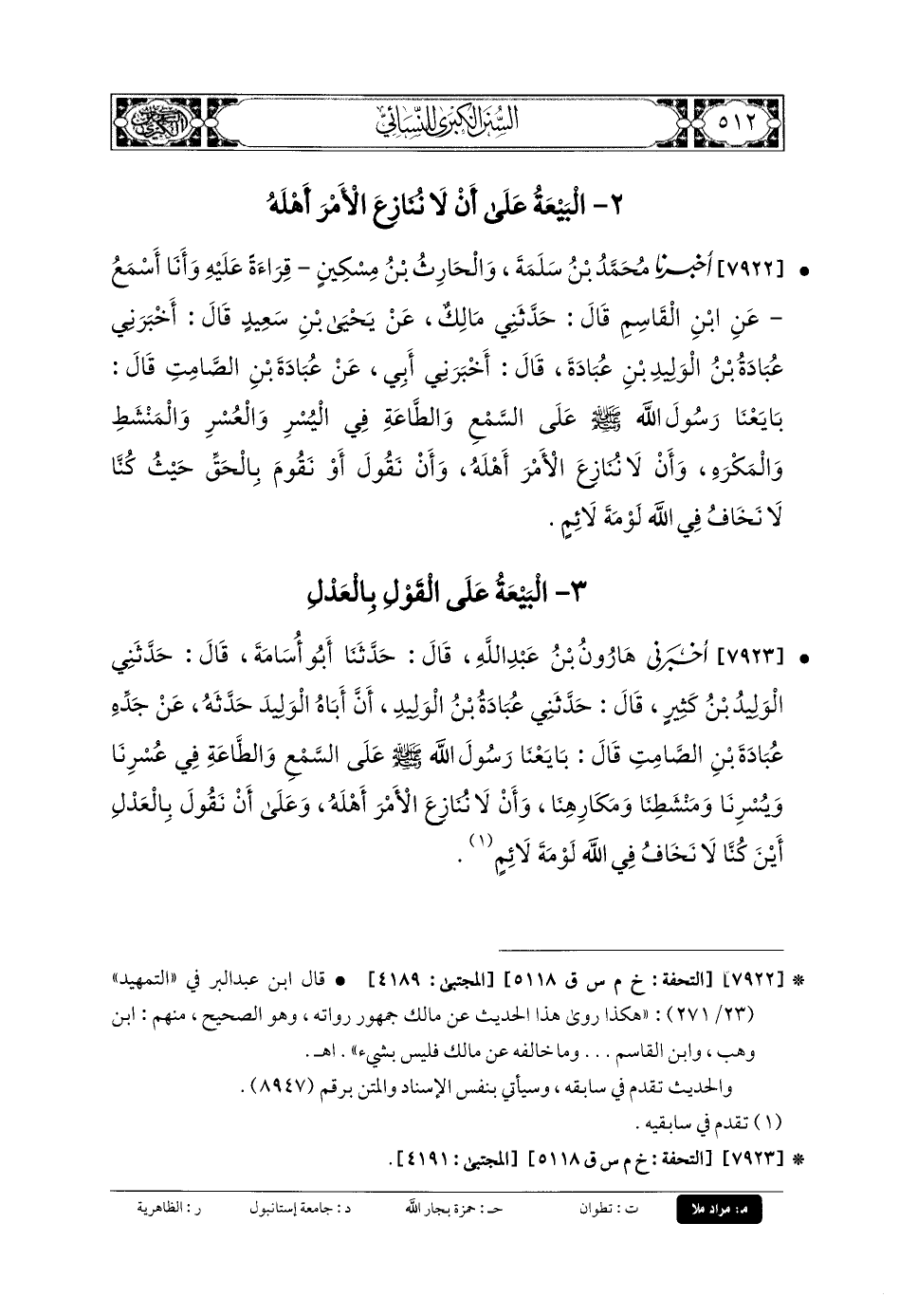7922- أَخبَرنا مُحَمدُ بنُ سَلَمَةَ. وَالحَارِثُ بنُ مِسْكِينٍ، قِرَاءَةً عَلَيْهِ، وَأنا أَسْمَعُ، عَنِ ابْنِ القَاسِمِ، قَالَ: حَدَّثني مَالِكٌ، عَن يَحْيَى بنِ سَعِيدٍ، قَالَ: أَخْبَرَنِي عُبَادَةُ بنُ الوَلِيدِ بنِ عُبَادَةَ، قَالَ: أَخْبَرَنِي أَبِي، عَن عُبَادَةَ بنِ الصَّامِتِ، قَالَ: بَايَعْنَا رَسُولَ اللهِ صَلى الله عَلَيهِ وسَلم عَلَى السَّمْعِ وَالطَّاعَةِ، فِي اليُسْرِ وَالعُسْرِ، وَالمَنْشَطِ وَالمَكْرَهِ، وَأَنْ لا نُنَازِعَ الأَمْرَ أَهْلَهُ، وَأَنْ نَقُولَ, أَوْ نَقُومَ بِالحَقِّ حَيْثُ كُنَّا، لا نَخَافُ فِي اللهِ لَوْمَةَ لائِمٍ.