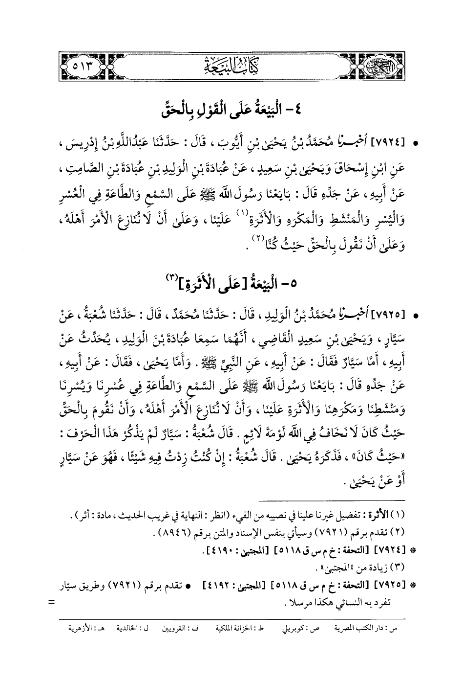 7924- أَخبَرنا مُحَمدُ بنُ يَحْيَى بنِ أَيوبَ، قَالَ: حَدَّثنا عَبدُ اللهِ بنُ إِدْرِيسَ، عَنِ ابْنِ إِسحَاقَ، وَيَحْيَى بنِ سَعِيدٍ، عَن عُبَادَةَ بنِ الوَلِيدِ بنِ عُبَادَةَ بنِ الصَّامِتِ، عَن أَبيهِ، عَن جَدِّهِ، قَالَ: بَايَعْنَا (1) رَسُولَ اللهِ صَلى الله عَلَيهِ وسَلم عَلَى السَّمْعِ وَالطَّاعَةِ، فِي العُسْرِ وَاليُسْرِ، وَالمَنْشَطِ وَالمَكْرَهِ، وَالأَثَرَةِ عَلَيْنَا، وَعَلَى أَنْ لا نُنَازِعَ الأَمْرَ أَهْلَهُ، وَعَلَى أَنْ نَقُولَ بِالحَقِّ حَيْثُ كُنَّا.