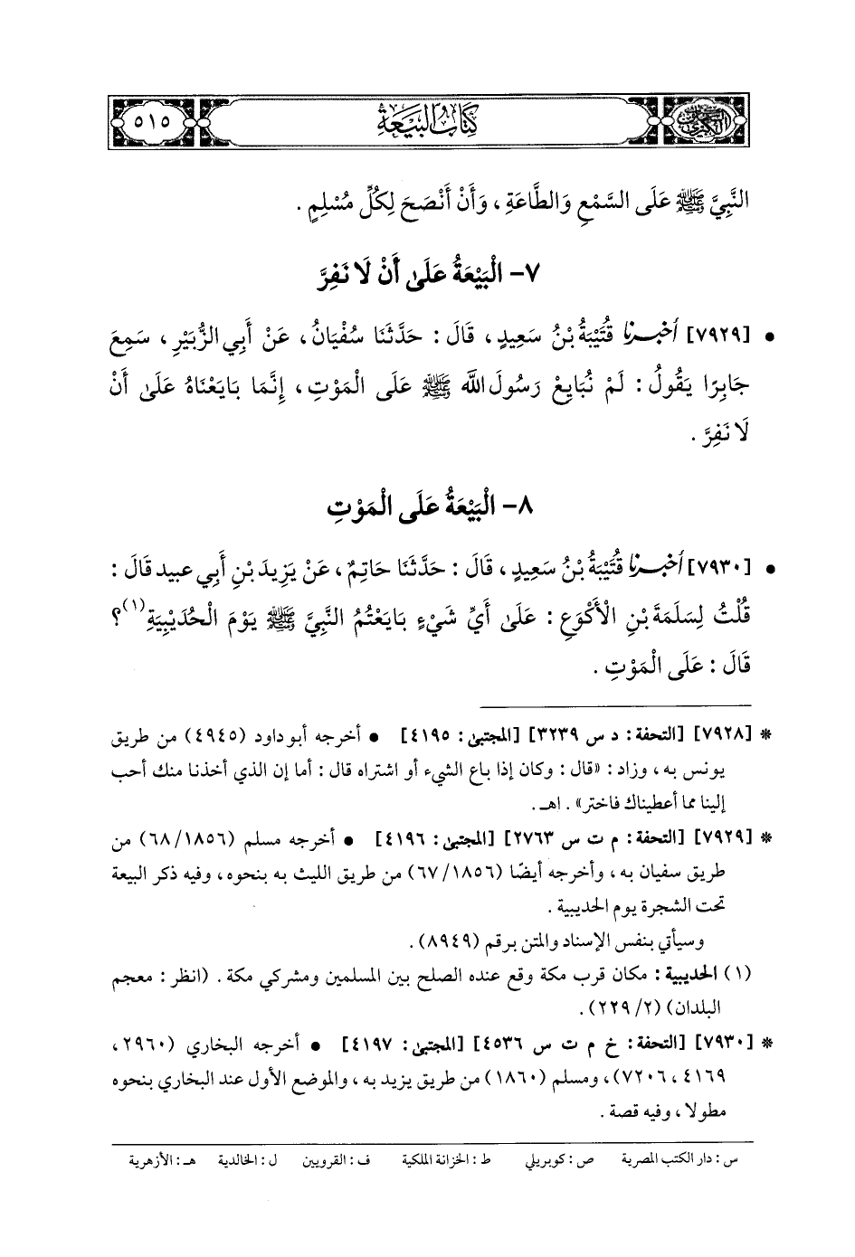 7930- أَخبَرنا قُتَيبَةُ بنُ سَعِيدٍ، قَالَ: حَدَّثنا حَاتِمٌ، عَن يَزِيدَ بنِ أَبي عُبَيْدٍ، قَالَ: قُلْتُ لِسَلَمَةَ بنِ الأَكْوَعِ: عَلَى أَيِّ شَيْءٍ بَايَعْتُمُ النَّبيَّ صَلى الله عَلَيهِ وسَلم يَوْمَ الحُدَيْبِيَةِ؟ قَالَ: عَلَى المَوْتِ.