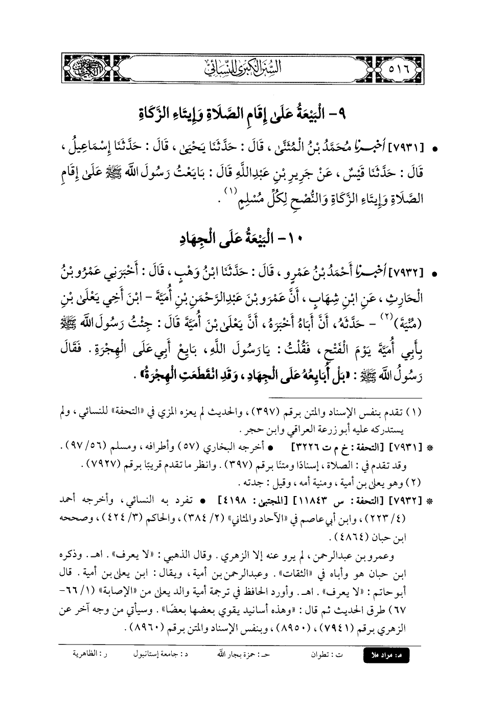 7932- أَخبَرنا أَحْمَدُ بنُ عَمْرٍو، قَالَ: حَدَّثنا ابْنُ وَهْبٍ، قَالَ: أَخْبَرَنِي عَمْرُو بنُ الحَارِثِ، عَنِ ابْنِ شِهَابٍ، أَنَّ عَمْرَو بْنَ عَبدِ الرَّحمَنِ بنِ أُمَيَّةَ, ابْنِ أَخِي يَعْلَى بنِ مُنْيَةَ (1) حَدَّثَهُ، أَنَّ أَبَاهُ أَخْبَرَهُ، أَنَّ يَعْلَى بْنَ أُمَيَّةَ قَالَ: جِئْتُ رَسُولَ اللهِ صَلى الله عَلَيهِ وسَلم بِأَبي أُمَيَّةَ يَوْمَ الفَتْحِ، فَقُلْتُ: يَا رَسُولَ اللهِ، بَايِعْ أَبي عَلَى الهِجْرَةِ، فَقَالَ رَسُولُ اللهِ صَلى الله عَلَيهِ وسَلم: بَلْ أُبَايِعُهُ عَلَى الجِهَادِ، وَقَدِ انْقَطَعَتِ الهِجْرَةُ.
