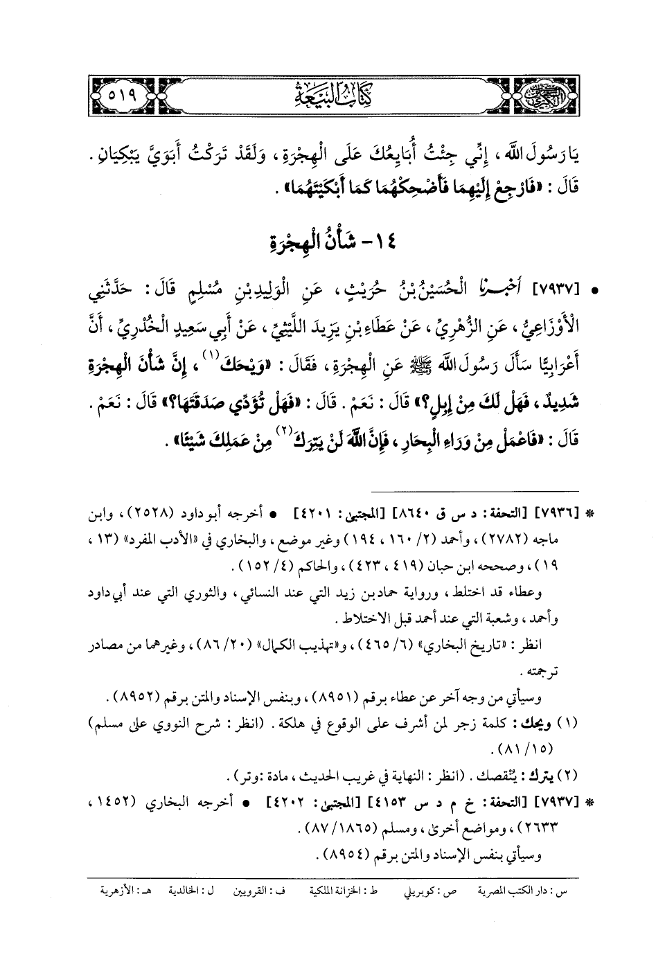 7937- أَخبَرنا الحُسَيْنُ بنُ حُرَيْثٍ، عَنِ الوَلِيدُ بنُ مُسْلِمٍ، قَالَ: حَدَّثنِي الأَوْزَاعِيُّ، عَنِ الزُّهْرِيِّ، عَن عَطَاءِ بنِ يَزِيدَ اللَّيْثِيِّ، عَن أَبي سَعِيدٍ الخُدْرِيِّ، أَنَّ أَعْرَابِيًّا سَأَلَ رَسُولَ اللهِ صَلى الله عَلَيهِ وسَلم عَنِ الهِجْرَةِ، فَقَالَ: وَيْحَكَ إِنَّ شَأْنَ الهِجْرَةِ شَدِيدٌ، فَهَلْ لَكَ مِنْ إِبِلٍ؟ قَالَ: نَعَمْ، قَالَ: فَهَلْ تُؤَدِّي صَدَقَتَهَا؟ قَالَ: نَعَمْ، قَالَ: فَاعْمَلْ مِنْ وَرَاءِ البِحَارِ، فَإِنَّ اللهَ لَنْ يَتِرَكَ مِنْ عَمَلِكَ شَيْئًا.