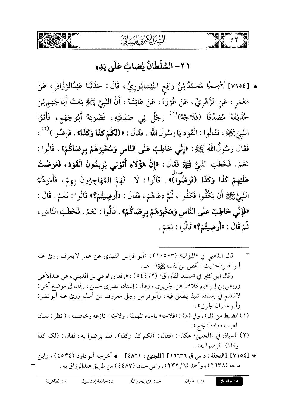 7154- أَخبَرنا مُحَمدُ بنُ رَافِعٍ النَّيْسَابُورِيُّ، قَالَ: حَدثنا عَبدُ الرَّزَّاقِ، عَن مَعْمَرٍ، عَنِ الزُّهْرِيِّ، عَن عُرْوَةَ، عَن عَائِشَةَ، أَنَّ النَّبيَّ صَلى الله عَلَيهِ وسَلم بَعَثَ أَبَا جَهْمِ بْنَ حُذَيْفَةَ مُصَدِّقًا، فَلاجَّهُ رَجُلٌ فِي صَدَقَتِهِ، فَضَرَبَهُ أَبو جَهْمٍ، فَأَتَوَا النَّبيَّ صَلى الله عَلَيهِ وسَلم، فَقَالُوا: القَوَدُ يَا رَسُولَ اللهِ، فَقَالَ: لَكُمْ كَذَا وَكَذَا، فَرَضُوا، فَقَالَ رَسُولُ اللهِ صَلى الله عَلَيهِ وسَلم: إِنِّي خَاطِبٌ عَلَى النَّاسِ، وَمُخْبِرُهُمْ بِرِضَاكُمْ، قَالُوا: نَعَمْ، فَخَطَبَ النَّبيُّ صَلى الله عَلَيهِ وسَلم، فَقَالَ: إِنَّ هَؤُلاءِ أَتَوْنِي يُرِيدُونَ القَوَدَ، فَعَرَضْتُ عَلَيْهِمْ كَذَا وَكَذَا فَرَضُوا، قَالُوا: لا، فَهَّمَ المُهَاجِرُونَ بِهِمْ، فَأَمَرَهُمُ النَّبيُّ صَلى الله عَلَيهِ وسَلم أَنْ يَكُفُّوا، فَكَفُّوا، ثُمَّ دَعَاهُمْ، فَقَالَ: أَرَضِيتُمْ؟ قَالُوا: نَعَمْ، قَالَ: فَإِنِّي خَاطِبٌ عَلَى النَّاسِ، وَمُخْبِرُهُمْ بِرِضَاكُمْ، قَالُوا: نَعَمْ، فَخَطَبَ النَّاسَ، ثُمَّ قَالَ: أَرَضِيتُمْ؟ قَالُوا: نَعَمْ.