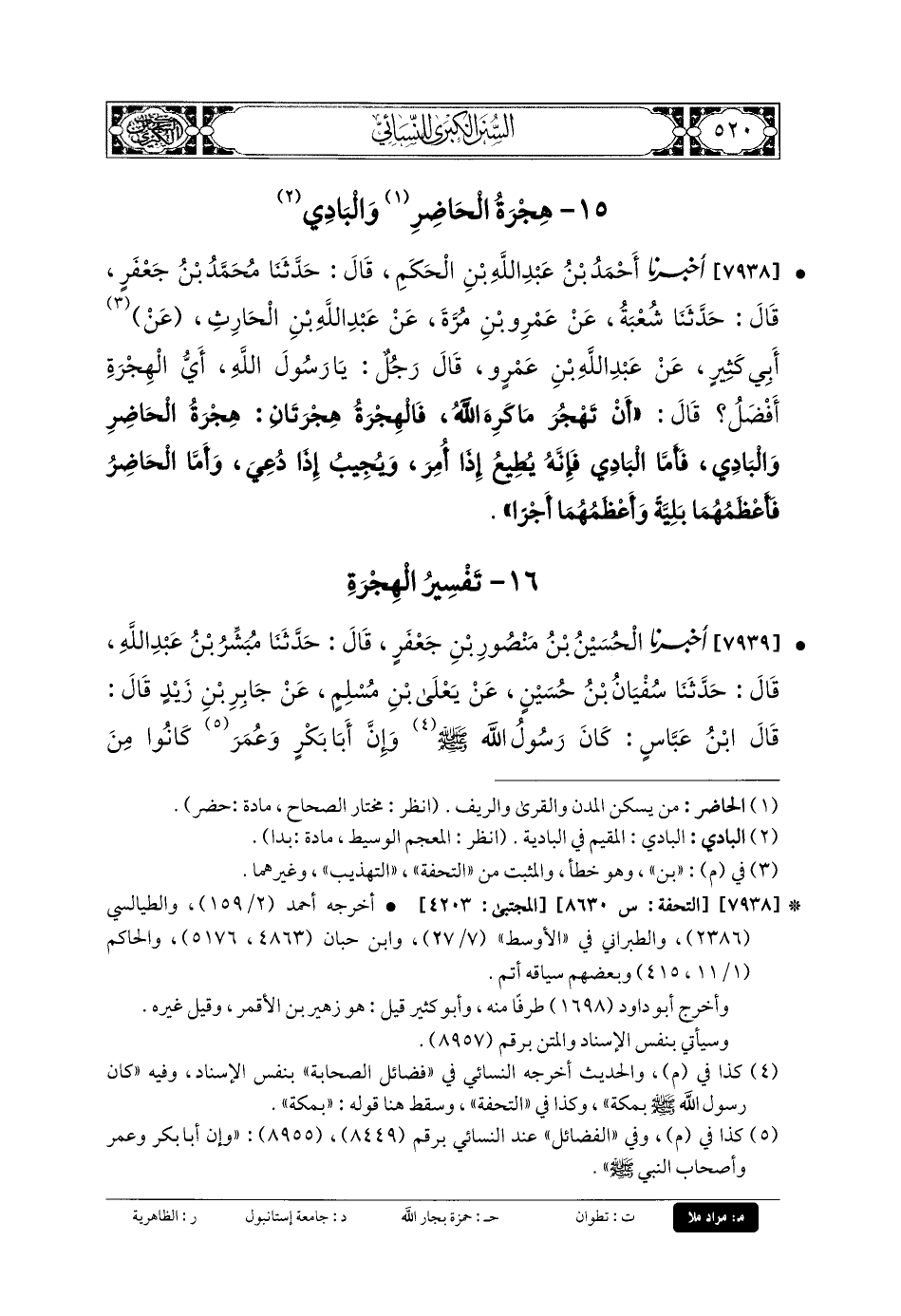7938- أَخبَرنا أَحْمَدُ بنُ عَبدِ اللهِ بنِ الحَكَمِ، قَالَ: حَدَّثنا مُحَمدُ بنُ جَعْفَرٍ، قَالَ: حَدَّثنا شُعْبَةُ، عَن عَمْرِو بنِ مُرَّةَ، عَن عَبدِ اللهِ بنِ الحَارِثِ، عَن أَبي كَثِيرٍ، عَن عَبدِ اللهِ بنِ عَمْرٍو, قَالَ رَجُلٌ: يَا رَسُولَ اللهِ، أَيُّ الهِجْرَةِ أَفْضَلُ؟ قَالَ: أَنْ تَهْجُرَ مَا كَرِهَ اللهُ، وَالهِجْرَةُ هِجْرَتَانِ، هِجْرَةُ الحَاضِرِ وَالبَادِي، فَأَمَّا البَادِي، فَإِنَّهُ يُطِيعُ إِذَا أُمِرَ, وَيُجِيبُ إِذَا دُعِيَ، وَأَمَّا الحَاضِرُ فَأَعْظَمُهُمَا بَلِيَّةً، وَأَعْظَمُهُمَا (1) أَجْرًا.