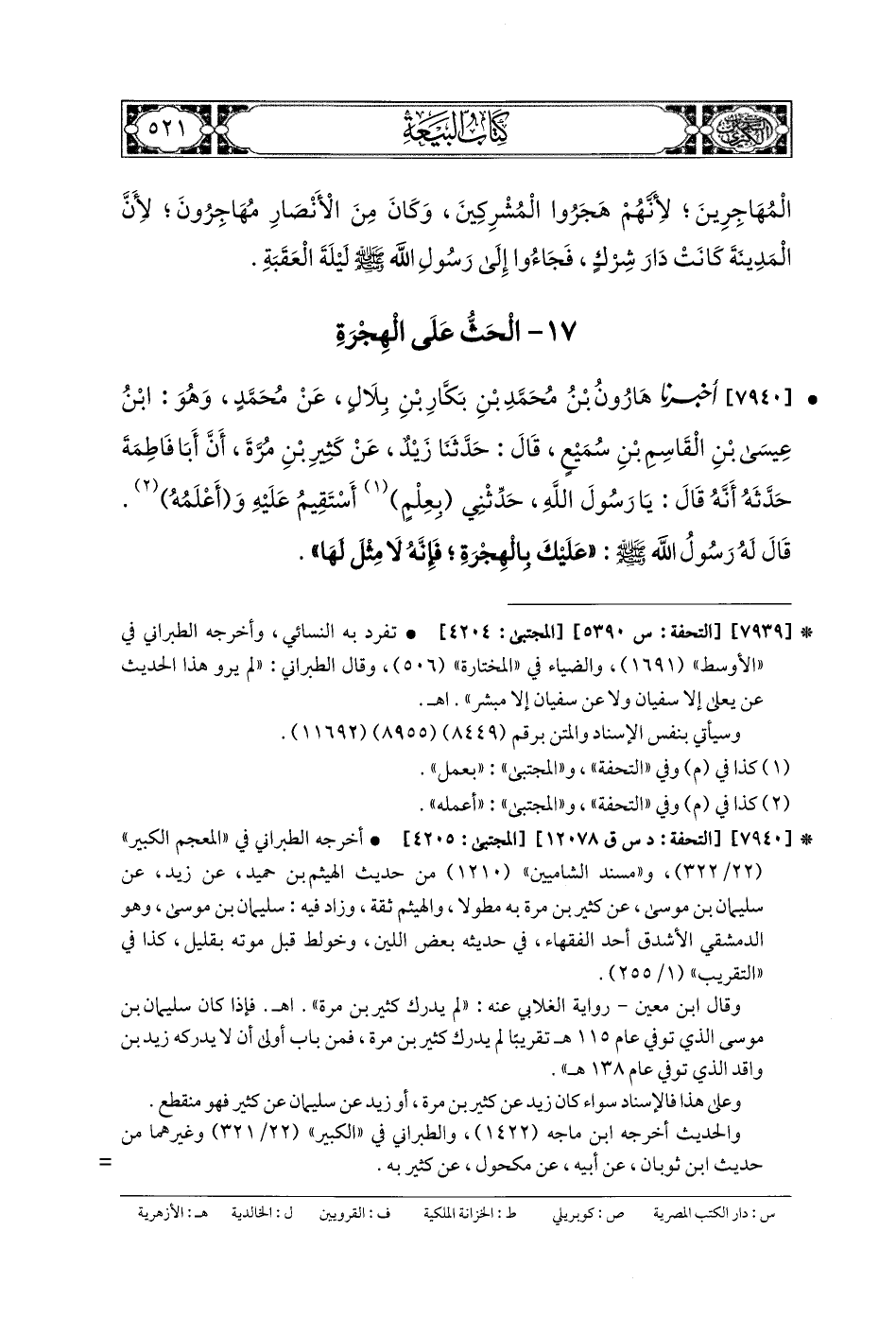 7940- أَخْبَرَنَا هَارُونُ بنُ مُحَمدِ بنِ بَكَّارِ بنِ بِلالٍ، عَن مُحَمدٍ، وَهُوَ ابْنُ عِيسَى بنِ القَاسِمِ بنِ سُمَيْعٍ، قَالَ: حَدَّثنا زَيْدٌ، عَن كَثِيرِ بنِ مُرَّةَ، أَنَّ أَبَا فَاطِمَةَ حَدَّثَهُ، أَنَّهُ قَالَ: يَا رَسُولَ اللهِ، حَدِّثْنِي بِعَمَلٍ (1) أَسْتَقِيمُ عَلَيْهِ وَأَعْمَلُهُ (2)، قَالَ لَهُ (3) رَسُولُ اللهِ صَلى الله عَلَيهِ وسَلم: عَلَيْكَ بِالهِجْرَةِ، فَإِنَّهُ لا مِثْلَ لَهَا.