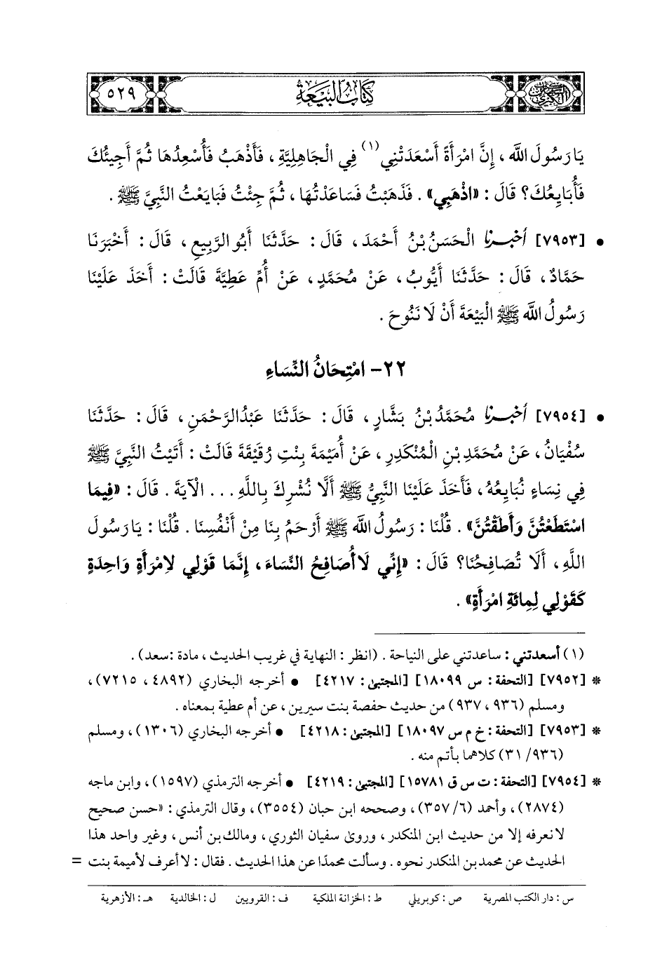 7953- أَخبَرنا الحَسَنُ بنُ أَحْمَدَ، قَالَ: حَدَّثنا أَبو الرَّبِيعِ، قَالَ: أَخبَرنا حَمَّادٌ، قَالَ: حَدَّثنا أَيوبُ، عَن مُحَمدٍ، عَن أُمِّ عَطِيَّةَ، قَالَتْ: أَخَذَ عَلَيْنَا رَسُولُ اللهِ صَلى الله عَلَيهِ وسَلم البَيْعَةَ أَنْ لا نَنُوحَ.