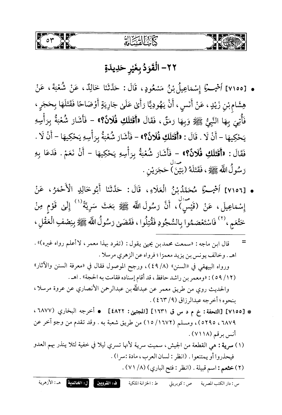 7155- أَخبَرنا إِسمَاعِيلُ بنُ مَسْعُودٍ، قَالَ: حَدثنا خَالِدٌ، عَن شُعبَةَ، عَن هِشَامِ بنِ زَيْدٍ، عَن أَنَسٍ، أَنَّ يَهُودِيًّا رَأَى عَلَى جَارِيَةٍ أَوْضَاحًا فَقَتَلَهَا بِحَجَرٍ، فَأُتِيَ بِهَا النَّبيُّ صَلى الله عَلَيهِ وسَلم وَبِهَا رَمَقٌ، فَقَالَ: أَقَتَلَكِ فُلانٌ؟ فَأَشَارَ شُعبَةُ بِرَأْسِهِ يَحْكِيهَا أَنْ لا، قَالَ: أَقَتَلَكِ فُلانٌ؟ فَأَشَارَ شُعبَةُ بِرَأْسِهِ يَحْكِيهَا أَنْ لا، فَقَالَ: أَقَتَلَكِ فُلانٌ؟ فَأَشَارَ شُعبَةُ بِرَأْسِهِ يَحْكِيهَا أَنْ نَعَمْ، فَدَعَا بِهِ رَسُولُ اللهِ صَلى الله عَلَيهِ وسَلم، فَقَتَلَهُ بَيْنَ حَجَرَيْنِ.
