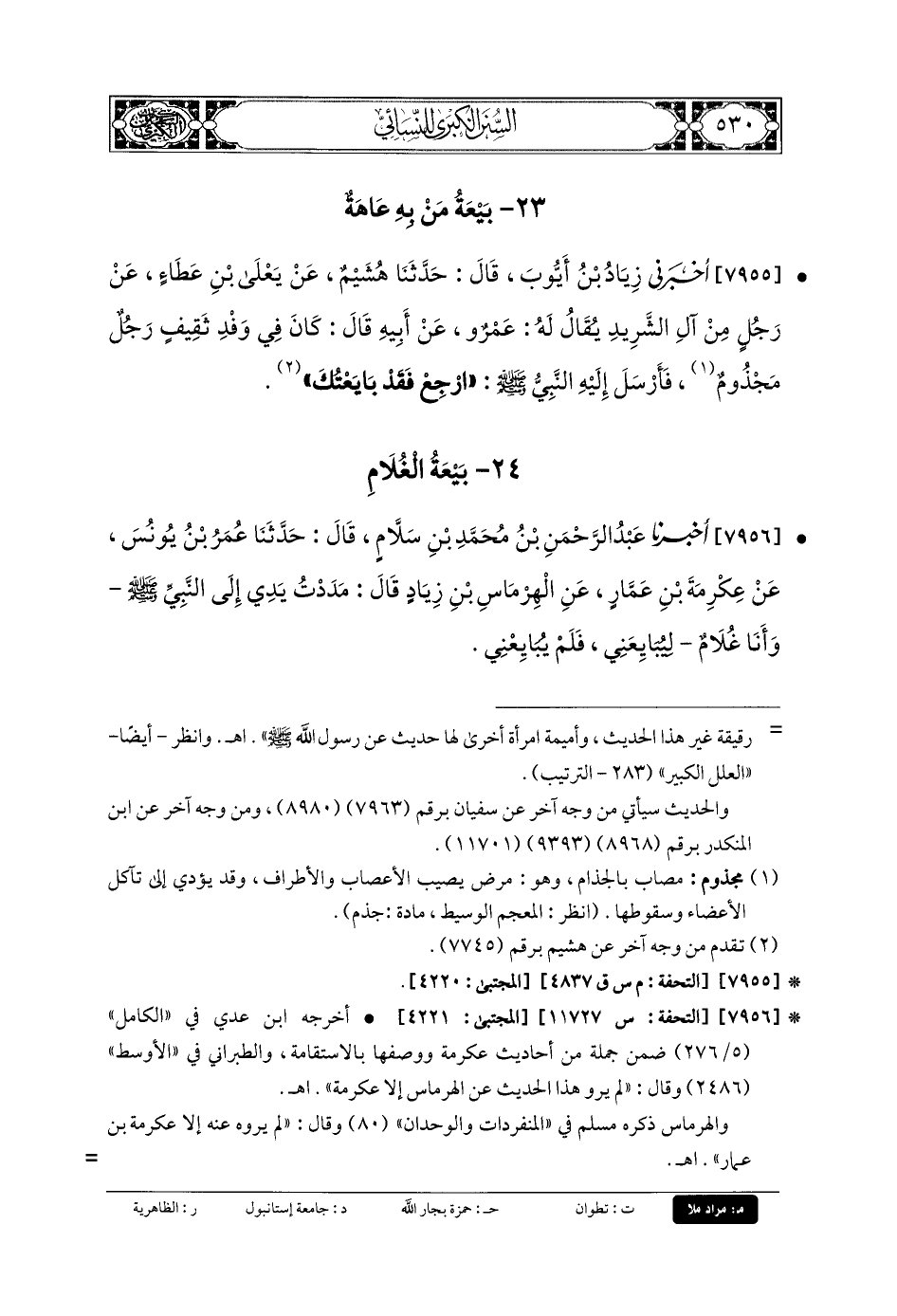7955- أَخْبَرَنِي زِيَادُ بنُ أَيوبَ، قَالَ: حَدَّثنا هُشَيْمٌ، عَن يَعْلَى بنِ عَطَاءٍ، عَن رَجُلٍ مِنْ آلِ الشَّرِيدِ, يُقَالُ لَهُ: عَمْرٌو، عَن أَبيهِ، قَالَ: كَانَ فِي وَفْدِ ثَقِيفٍ رَجُلٌ مَجْذُومٌ، فَأَرْسَلَ إِلَيْهِ النَّبيُّ صَلى الله عَلَيهِ وسَلم: ارْجِعْ فَقَدْ بَايَعْتُكَ (1).