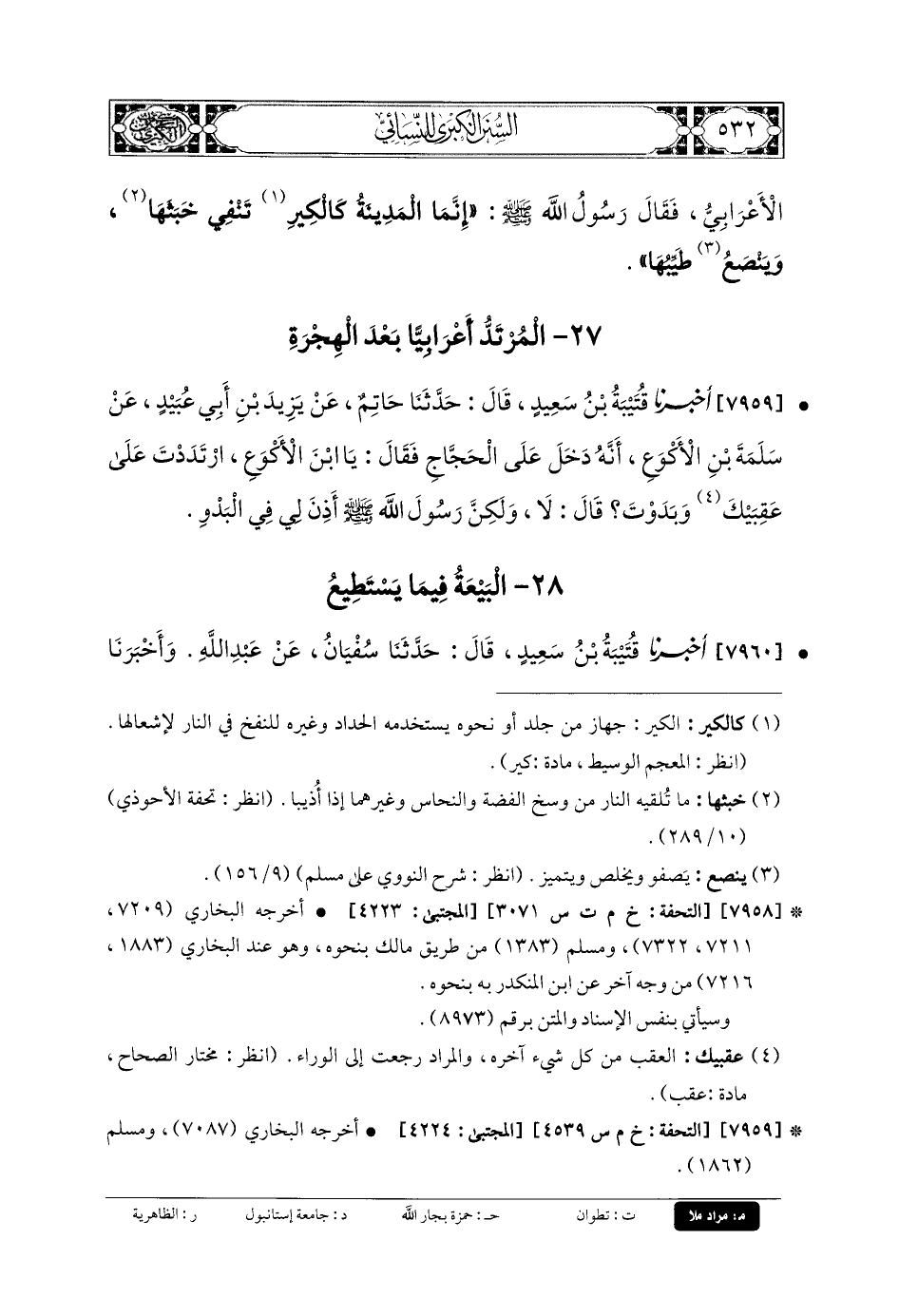 7959- أَخبَرنا قُتَيبَةُ بنُ سَعِيدٍ، قَالَ: حَدَّثنا حَاتِمٌ، عَن يَزِيدَ بنِ أَبي عُبَيْدٍ، عَن سَلَمَةَ بنِ الأَكْوَعِ، أَنَّهُ دَخَلَ عَلَى الحَجَّاجِ فَقَالَ: يَا ابْنَ الأَكْوَعِ، ارْتَدَدْتَ عَلَى عَقِبَيْكَ وَبَدَوْتَ؟ قَالَ: لا، وَلَكِنَّ رَسُولَ اللهِ صَلى الله عَلَيهِ وسَلم أَذِنَ لِي فِي البَدْوِ.