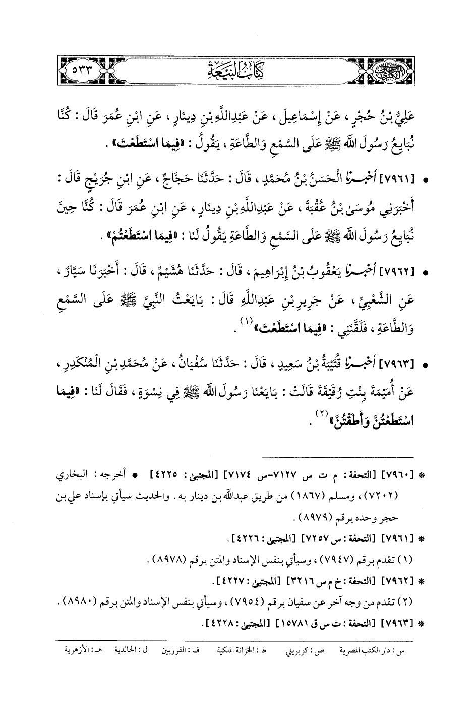 7961- أَخبَرنا الحَسَنُ بنُ مُحَمدٍ، قَالَ: حَدَّثنا حَجَّاجٌ، عَنِ ابْنِ جُرَيْجٍ، قَالَ: أَخْبَرَنِي مُوسَى بنُ عُقْبَةَ، عَن عَبدِ اللهِ بنِ دِينَارٍ، عَنِ ابْنِ عُمَرَ، قَالَ: كُنَّا حِينَ نُبَايِعُ رَسُولَ اللهِ صَلى الله عَلَيهِ وسَلم عَلَى السَّمْعِ وَالطَّاعَةِ، يَقُولُ لَنَا: فِيمَا اسْتَطَعْتُمْ (1).