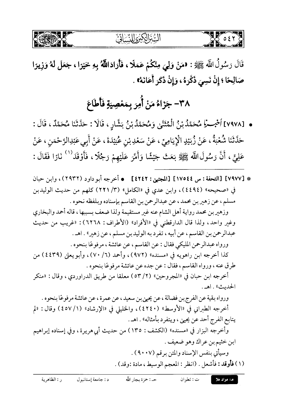 7978- أَخبَرنا مُحَمدُ بنُ المُثَنَّى، وَمُحَمدُ بنُ بَشَّارٍ، قَالا: حَدَّثنا مُحَمدٌ، قَالَ: حَدَّثنا شُعْبَةُ، عَن زُبَيْدٍ الإِيَامِيِّ، عَن سَعْدِ بنِ عُبَيْدَةَ، عَن أَبي عَبدِ الرَّحمَنِ، عَن عَليٍّ، أَنَّ رَسُولَ اللهِ صَلى الله عَلَيهِ وسَلم بَعَثَ جَيْشًا، وَأَمَّرَ عَلَيْهِمْ رَجُلاً، فَأَوْقَدَ نَارًا، فَقَالَ: ادْخُلُوهَا، فَأَرَادَ نَاسٌ أَنْ يَدْخُلُوهَا، وَقَالَ الآخَرُونَ: إِنَّا فَرَرْنَا مِنْهَا، فَذُكِرَ ذَلِكَ لِرَسُولِ اللهِ صَلى الله عَلَيهِ وسَلم، فَقَالَ لِلَّذِينَ أَرَادُوا أَنْ يَدْخُلُوهَا: لَوْ دَخَلْتُمُوهَا لَمْ تَزَالُوا فِيهَا إِلَى يَوْمِ القِيَامَةِ، وَقَالَ لِلآخَرِينَ خَيْرًا، وَقَالَ ابْنُ المُثَنَّى: قَوْلاً حَسَنًا.