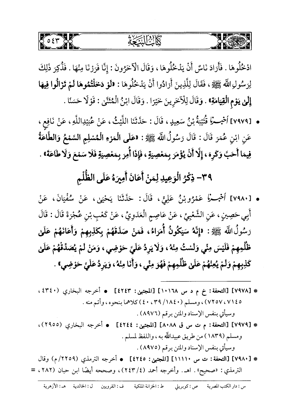 7980- أَخبَرنا عَمْرُو بنُ عَليٍّ، قَالَ: حَدَّثنا يَحْيَى، عَن سُفيانَ، عَن أَبي حَصِينٍ، عَنِ الشَّعْبِيِّ، عَن عَاصِمٍ العَدَوِيِّ، عَن كَعْبِ بنِ عُجْرَةَ، قَالَ: قَالَ رَسُولُ اللهِ صَلى الله عَلَيهِ وسَلم: إِنَّهُ سَيَكُونُ أُمَرَاءُ فَمَنْ صَدَّقَهُمْ بِكَذِبِهِمْ، وَأَعَانَهُمْ عَلَى ظُلْمِهِمْ, فَلَيْسَ مِنِّي، وَلَسْتُ مِنْهُ، وَلا يَرِدُ عَلَيَّ حَوْضِي، وَمَنْ لَمْ يُصَدِّقْهُمْ عَلَى كَذِبِهِمْ، وَلَمْ يُعِنْهُمْ عَلَى ظُلْمِهِمْ، فَهُوَ مِنِّي وَأَنَا مِنْهُ، وَيَرِدُ عَلَيَّ حَوْضِي.